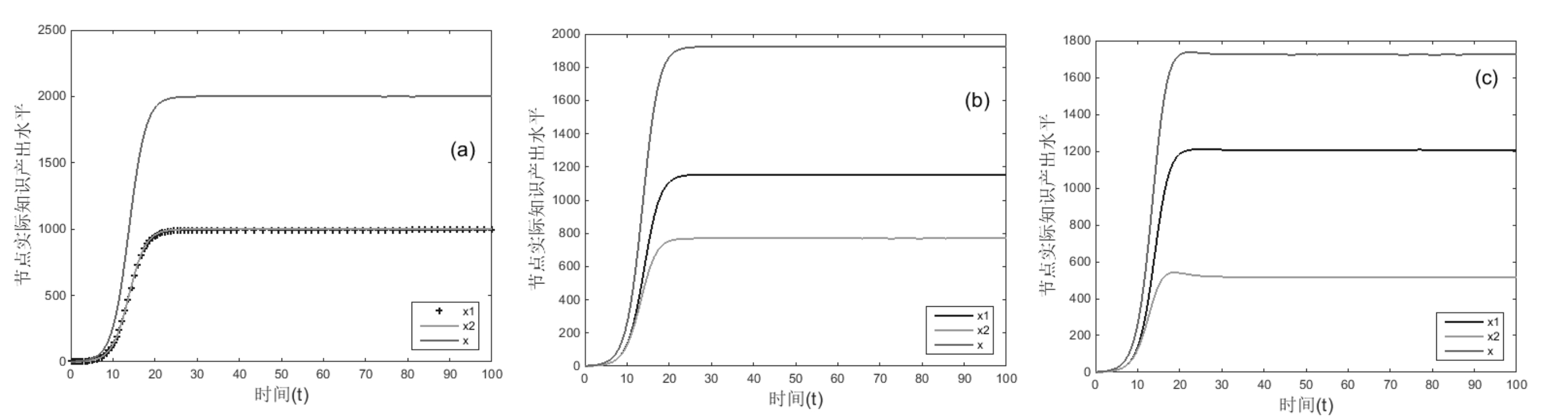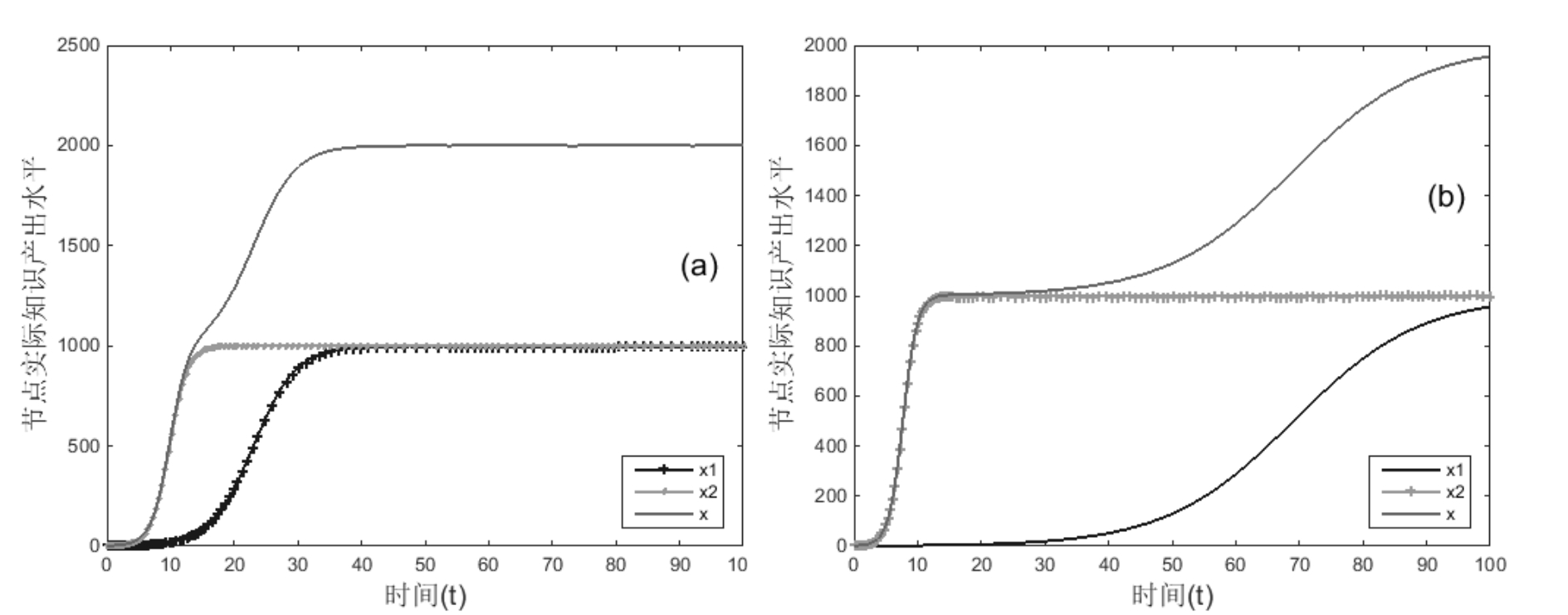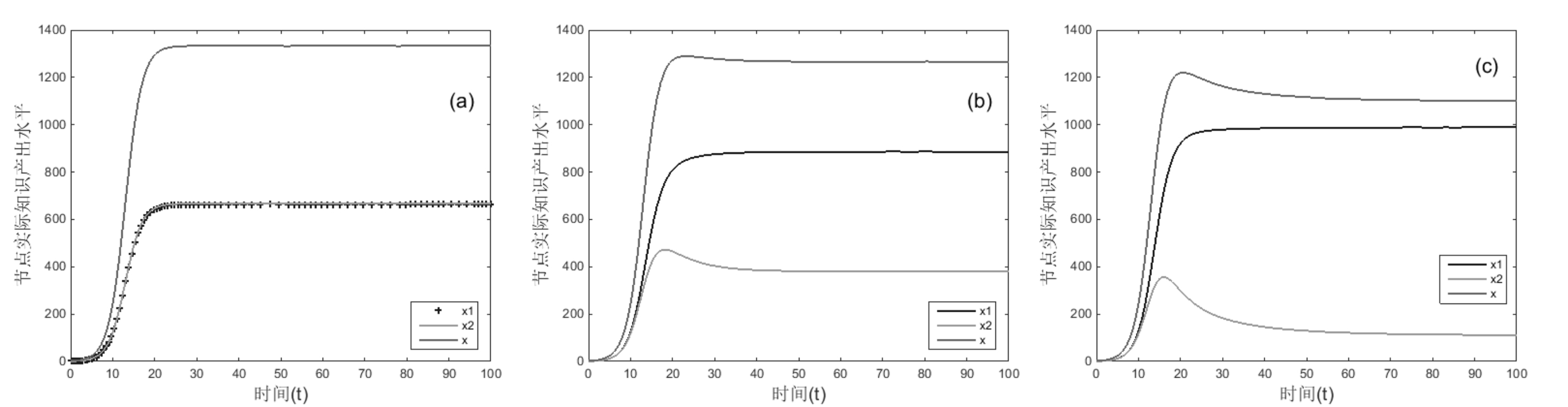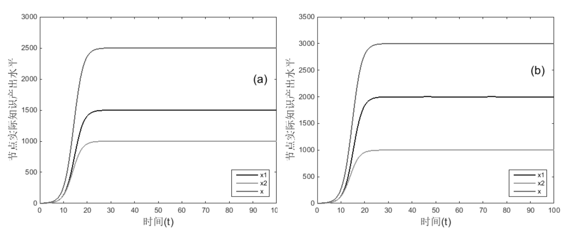 αij=αji=0,增长率r变化,其它不变,运行结果如图14所示。对比图7(a)和图14,可得运行结果10:处于互惠关系节点的增长率差值|r1-r2|对共生关系达到平衡后的总实际知识产出水平无显著影响,对达到平衡的时间具有显著正向影响;节点增长率r对实际知识产出水平x具有显著正向影响。