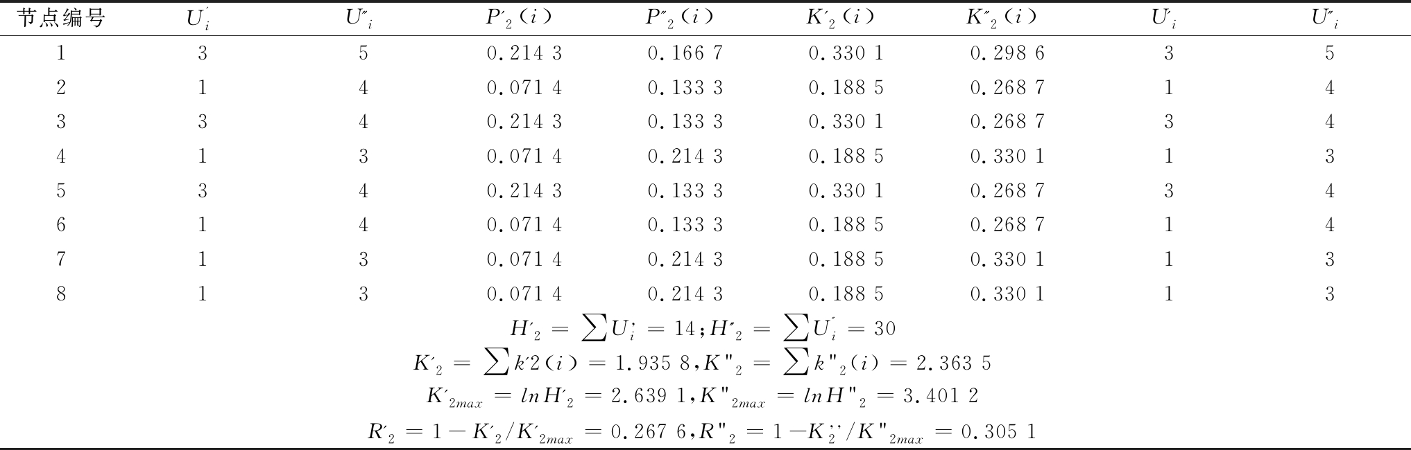 节点编号U'iU''iP'2i P''2i K'2i K''2i U'iU''i1350.214 30.166 70.330 10.298 6352140.071 40.133 30.188 50.268 7143340.214 30.133 30.330 10.268 7344130.071 40.214 30.188 50.330 1135340.214 30.133 30.330 10.268 7346140.071 40.133 30.188 50.268 7147130.071 40.214 30.188 50.330 1138130.071 40.214 30.188 50.330 113H'2=∑U,i=14;H''2=∑U''i=30K'2=∑k'2i =1.935 8,K"2=∑k"2(i)=2.363 5K'2max=lnH'2=2.639 1,K"2max=lnH"2=3.401 2R'2=1-K'2/K'2max=0.267 6,R"2=1-K,,2/K"2max=0.305 1