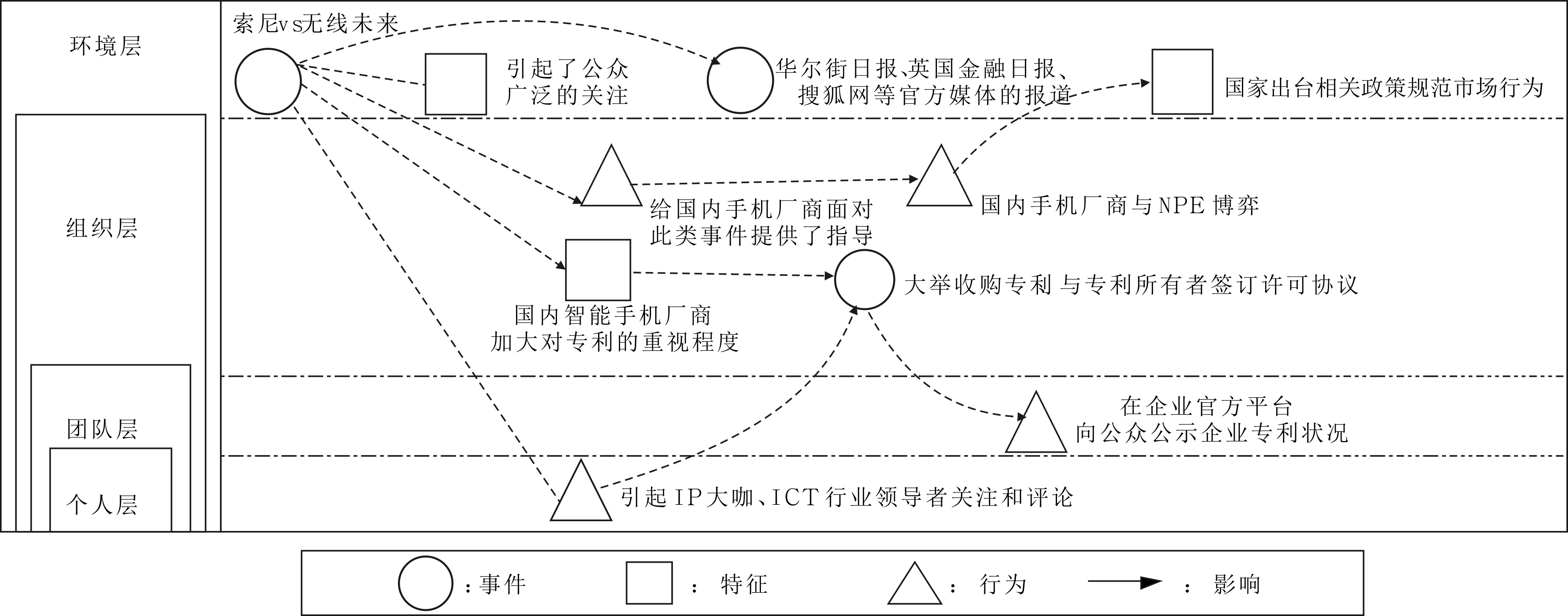 (1)事件空间的方向性(Event Spatial Direction):反映事件在环境、组织、团队、个人4个层面的纵向扩散。无线未来诉索尼移动的事件空间方向性模型见图1,美国法律政策对NPE不友好[24](事件1)、中国知识产权保护环境日益改善(特征)以及中国巨大的市场潜力(特征),吸引了NPE来到中国(行为)。索尼移动和无线未来(NPE)就专利许可进行长达两年的谈判(事件2),最终谈判破裂(事件3)。无线未来将索尼移动起诉至南京中院(事件4),要求索尼移动停止侵权并且赔偿800万元损失。针对无线未来的起诉,索尼移动在向江苏省高级人民法院提起管辖权异议(事件5),同时向国家知识产权复审委员会提起专利无效申请(事件6)。无线未来起诉索尼移动的事件是中国第一起外国NPE对ICT企业发起的专利诉讼,吸引了公众广泛关注(特征),国际主流媒体如英国《金融日报》、美国《华尔街日报》先后报道了该事件(事件7),大量企业家、专家学者均公开表示密切关注案件进展(事件8)。2017年3月,国家知识产权复审委员会宣告无线未来的专利部分无效(事件9),导致无线未来撤销对索尼移动的起诉(事件10),进而使索尼移动从面临严重危机(特征)转危为安(特征)。此次事件使索尼移动管理层加大力度完善企业知识产权布局(行为)。无线未来起诉索尼(事件4)反映出我国ICT企业外部环境变化(特征),导致国内智能手机厂商对专利的重视程度进一步提升(特征),加大了从通信巨头手中收购专利或获得许可(行为)的力度。例如,2016年小米接连从英特尔、微软、诺基亚手中收购大量专利。另外,ICT企业高层对本案的关注(事件8)也对企业战略制定产生了影响(行为),间接影响企业专利布局变化(行为)。