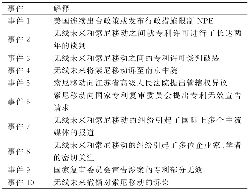 事件解释事件1美国连续出台政策或发布行政措施限制NPE事件2无线未来和索尼移动之间就专利许可进行了长达两年的谈判事件3无线未来和索尼移动之间的专利许可谈判破裂事件4无线未来将索尼移动诉至南京中院事件5索尼移动向江苏省高级人民法院提出管辖权异议事件6索尼移动向国家专利复审委员会提出专利无效宣告请求事件7无线未来和索尼移动的纠纷引起了国际上多个主流媒体的报道事件8无线未来和索尼移动的纠纷引起了多位企业家、学者的密切关注事件9国家复审委员会宣告涉案的专利部分无效事件10无线未来撤销对索尼移动的诉讼