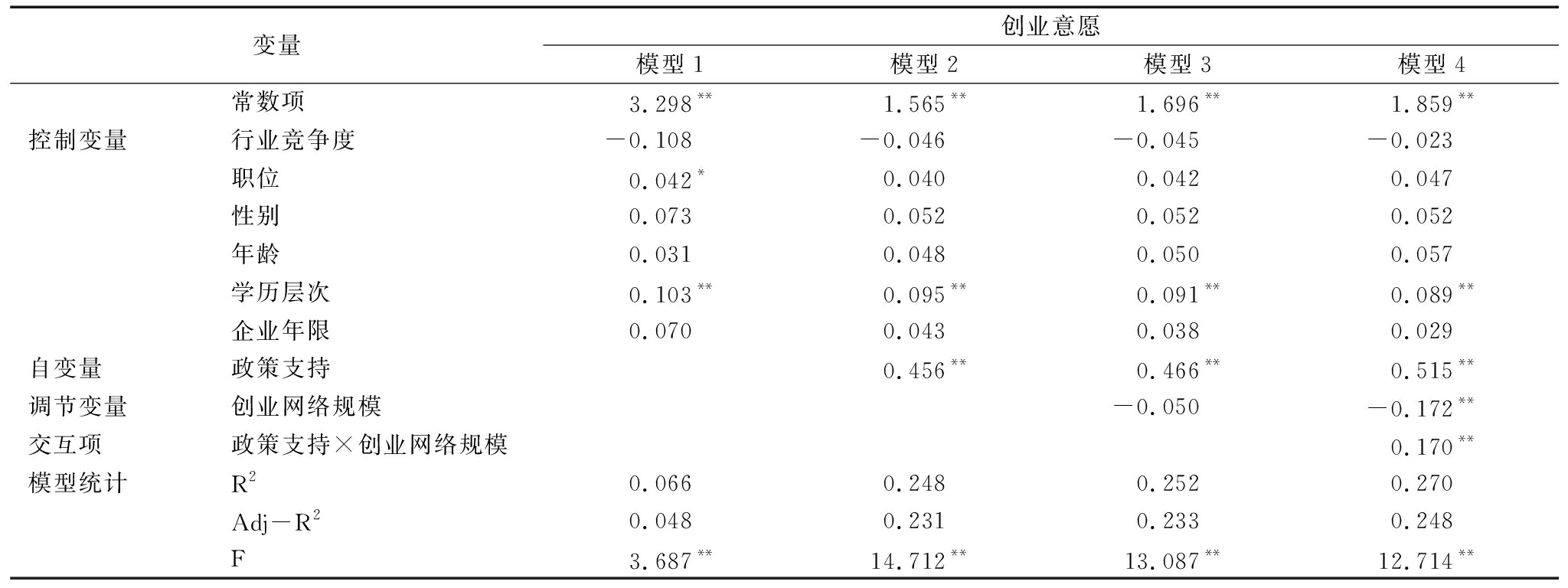变量创业意愿模型1模型2模型3模型4常数项3.298**1.565**1.696**1.859**控制变量行业竞争度-0.108-0.046-0.045-0.023职位0.042*0.0400.0420.047性别0.0730.0520.0520.052年龄0.0310.0480.0500.057学历层次0.103**0.095**0.091**0.089**企业年限0.0700.0430.0380.029自变量政策支持0.456**0.466**0.515**调节变量创业网络规模-0.050-0.172**交互项政策支持×创业网络规模0.170**模型统计R20.0660.2480.2520.270Adj-R20.0480.2310.2330.248F3.687**14.712**13.087**12.714**