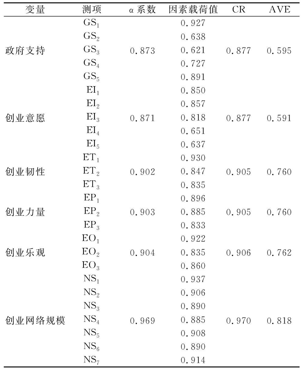(1)信度效度检验。使用SPSS 22.0和AMOS 21.0对样本进行信度以及组合、聚合、区分效度检验(根据通常标准,以0.8作为Cronbach′s α信度系数的临界值),结果见表2,变量各维度的Cronbach′s α系数均大于0.8,说明具有良好信度。因素负荷量最小为0.621,最大为0.937,且均在p<0.01的水平上显著,符合因素负荷量介于0.5~0.95之间的要求。组合信度(CR)均大于0.8,达到组合信度大于0.8的要求。平均变异量抽取值(AVE)均大于0.5,达到平均变异量抽取值大于0.5的要求,具有良好的聚合效度。此外,对政府支持、创业意愿、创业韧性、创业力量、创业乐观、创业网络规模6个变量进行验证性因子分析,反映模型拟合情况的指标包括相对卡方(χ2/)、RMSEA、CFI和IFI,其中,χ2/=1.875<3,CFI=0.963>0.9,IFI=0.963>0.9,RMSEA=0.052<0.08,TLI=0.958>0.9,各项指标符合要求,说明变量之间具有较好区分效度。