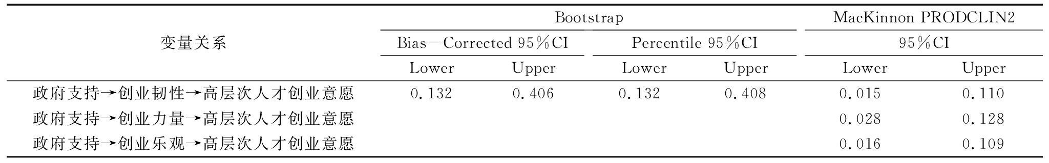 变量关系BootstrapBias-Corrected 95%CILowerUpperPercentile 95%CILowerUpperMacKinnon PRODCLIN295%CILowerUpper政府支持→创业韧性→高层次人才创业意愿0.1320.4060.1320.4080.0150.110政府支持→创业力量→高层次人才创业意愿0.0280.128政府支持→创业乐观→高层次人才创业意愿0.0160.109