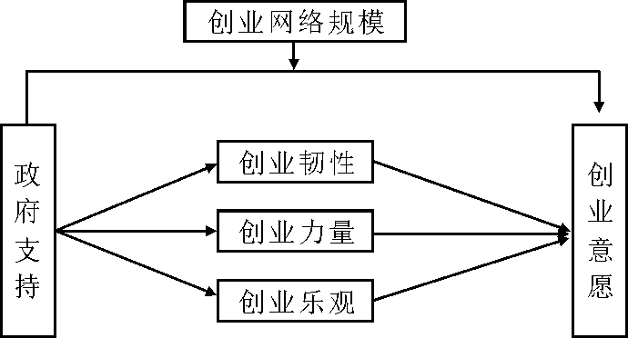 鉴于此,本文借鉴创业者心理弹性中有关创业韧性、创业力量、创业乐观等维度的研究[5],以及创业网络规模相关研究,理解创业特质,分析其对创业意愿的影响。因此,本研究重点聚焦云南省高创园、省青年企业家协会、省青年联合会、青年创业省长奖获得者等高层次人才,致力于挖掘高层次创业者独特属性在政府支持与创业意愿之间的影响作用,并引入创业者心理弹性作为中介变量、创业网络规模作为调节变量,分析政府支持影响高层次人才创业意愿的路径和作用边界,为政府完善创业政策提供理论依据。
