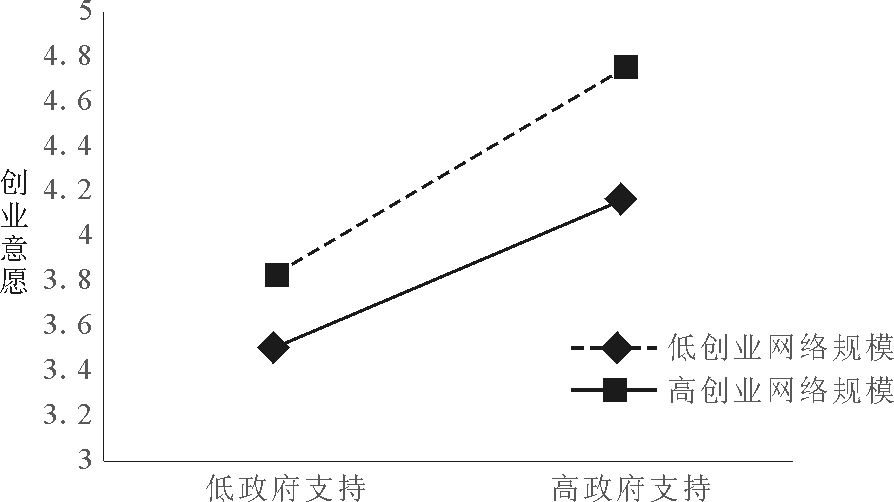 H3:创业网络规模在政府支持促进高层次人才创业意愿的过程中具有正向调节作用。