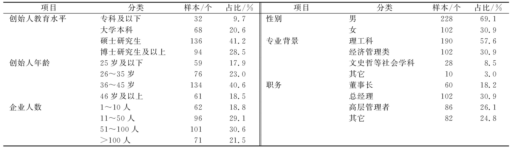 项目分类样本/个占比/%项目分类样本/个占比/%创始人教育水平专科及以下329.7性别男22869.1大学本科6820.6女10230.9硕士研究生13641.2专业背景理工科19057.6博士研究生及以上9428.5经济管理类10230.9创始人年龄25岁及以下5917.9文史哲等社会学科288.526~35岁7623.0其它103.036~45岁13440.6职务董事长6018.246岁及以上6118.5总经理10230.9企业人数1~10人6218.8高层管理者8626.111~50人9629.1其它8224.851~100人10130.6>100人7121.5