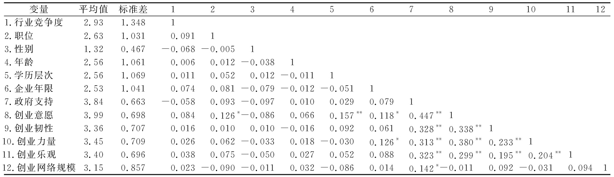 变量平均值标准差1234567891011121.行业竞争度 2.931.34812.职位 2.631.0310.09113.性别 1.320.467-0.068-0.00514.年龄 2.561.0610.0060.012-0.03815.学历层次 2.561.0690.0110.0520.012-0.01116.企业年限 2.531.0410.0740.081-0.079-0.012-0.05117.政府支持 3.840.663-0.0580.093-0.0970.0100.0290.07918.创业意愿 3.990.6980.0840.126*-0.0860.0660.157**0.118*0.447**19.创业韧性 3.360.7070.0160.0100.010-0.0160.0920.0610.328**0.338**110.创业力量 3.450.7090.0260.062-0.0330.018-0.0300.126*0.313**0.380**0.233**111.创业乐观 3.400.6960.0380.075-0.0500.0270.0520.0880.323**0.299**0.195**0.204**112.创业网络规模3.150.8570.023-0.090-0.0110.032-0.0860.0140.142*-0.0110.092-0.0310.094 1