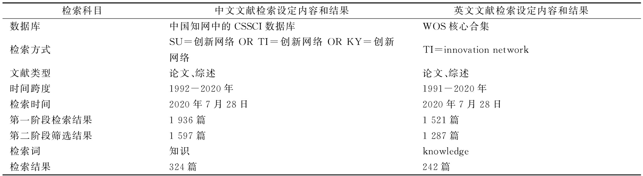 为充分获取国内外创新网络领域知识主题研究的高质量文献,本文遵循两阶段综述方法[9],搜寻创新网络领域文献,以减少文献数据搜集偏差。第一阶段,为保证文献数据权威性和可操作性[10],本文以中国知网(CNKI)和Web of Science(WOS)核心合集作为文献数据检索平台,对中外文文献进行检索搜寻。需要说明的是,检索中文文献时,首先依据2020版国家自然科学基金委员会管理科学部“管理科学重要学术期刊表”及另外7种高质量期刊(《中国社会科学》《经济研究》《社会学研究》《中国社会科学文摘》《外国经济与管理》《中国行政管理》《经济管理》)进行检索,然后选择中国知网(CNKI)CSSCI数据库进行检索。第二阶段,经过初步检索后,通过文献类型界定、主题过滤、摘要阅读分析等方法对检索结果进行进一步筛查,剔除不符文献,最终得到创新网络领域中文文献1 597篇,英文文献1 287篇。然后,在文献管理软件中分别以知识和knowledge作为检索词找出该领域中与知识主题研究相关的文献,共得到中文文献324篇,英文文献242篇。文献获取与筛选具体过程见表1。