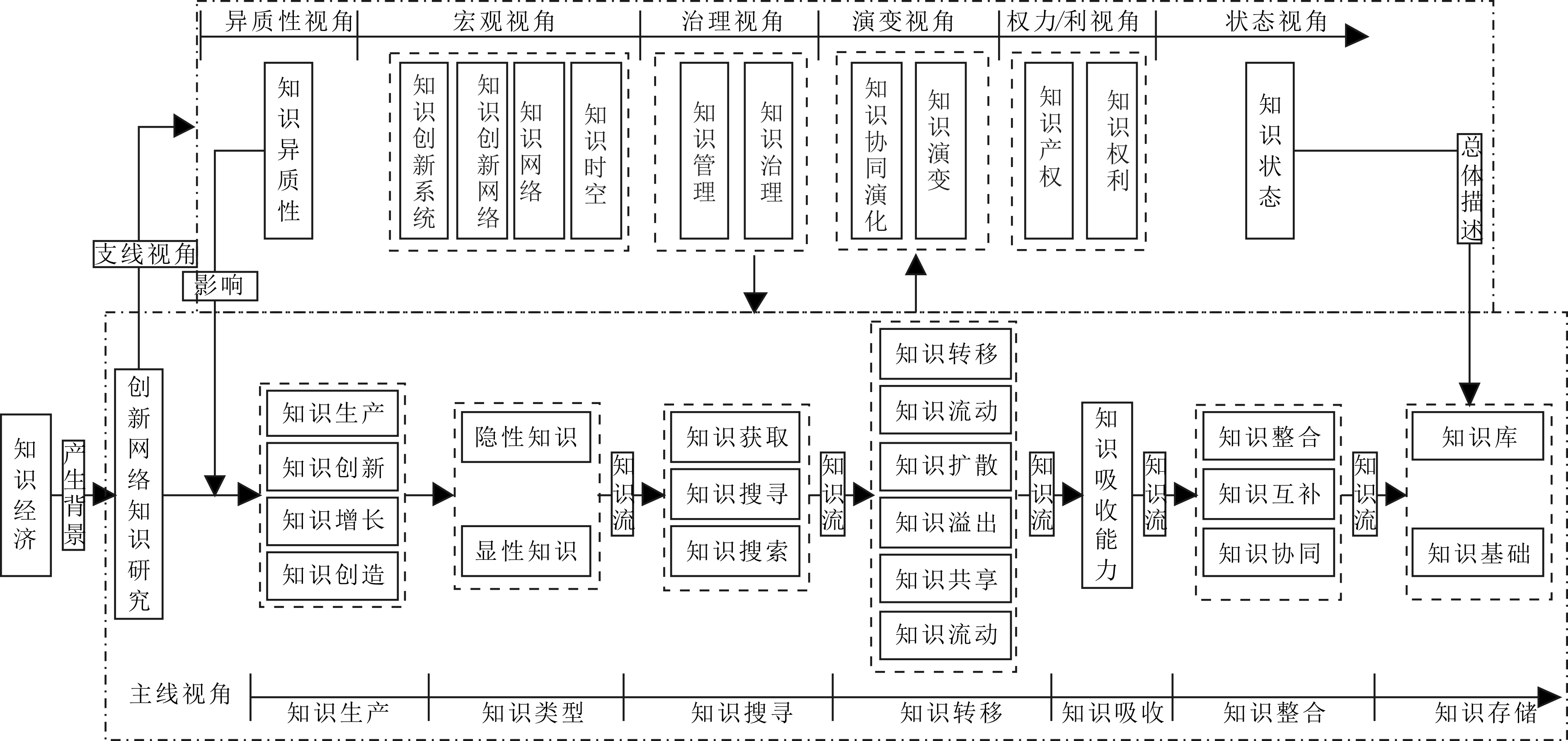 结合上文分析,本文对创新网络领域知识主题相关研究进行整理,如图7所示,创新网络领域知识主题研究发展脉络可以分为一条主线、4条支线。主线是从知识研究的产生背景一直到企业知识基础或知识库的全部过程,该过程涵盖网络中创新知识的产生、类型、搜寻与获取、传播、吸收、整合以及知识库构建等各个环节;4条支线分别是基于治理视角的知识治理(管理)、基于时间视角的知识演变(协同演变)、基于权力/权利视角的知识权力与知识产权及基于宏观视角的知识创新系统、知识网络、知识时空等方面的研究。此外,知识异质性对知识创造与生产具有重要影响,知识状态则是对知识存量、知识结构、知识分布等基本属性的总体描述。综上可以发现,国内外学者在研究过程中提出了许多内涵差异性不大的重复性概念,对研究视角的拓展贡献不大,如何找到新的研究对象,提出新的研究视角是未来努力的方向。