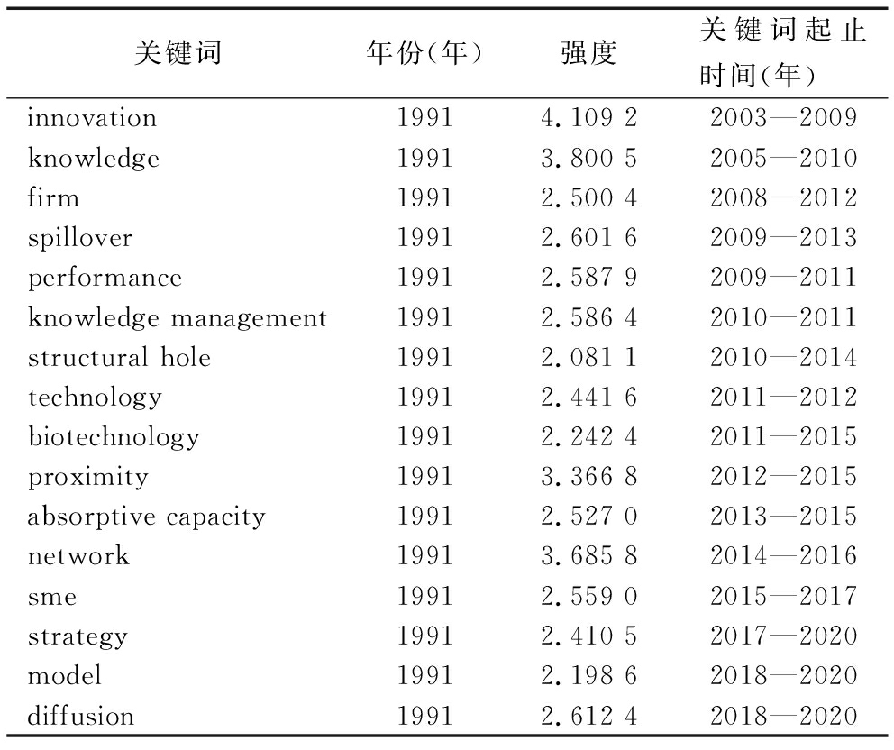 关键词年份(年)强度关键词起止时间(年)innovation19914.109 22003—2009knowledge19913.800 52005—2010firm19912.500 42008—2012spillover19912.601 62009—2013performance19912.587 92009—2011knowledge management19912.586 42010—2011structural hole19912.081 12010—2014technology19912.441 62011—2012biotechnology19912.242 42011—2015proximity19913.366 82012—2015absorptive capacity19912.527 02013—2015network19913.685 82014—2016sme19912.559 02015—2017strategy19912.410 52017—2020model19912.198 62018—2020diffusion19912.612 42018—2020