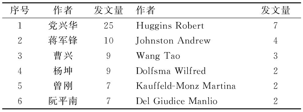 表3是国内外创新网络领域知识主题研究的作者统计情况。可以发现,国内作者除党兴华、曾刚、曹兴等人外,杨坤、阮平南等也是重要研究力量。国外研究虽未形成具有代表性的核心研究团队,但Huggins Robert、Johnston Andrew、Wang Tao等人是知识主题研究领域的代表性学者。