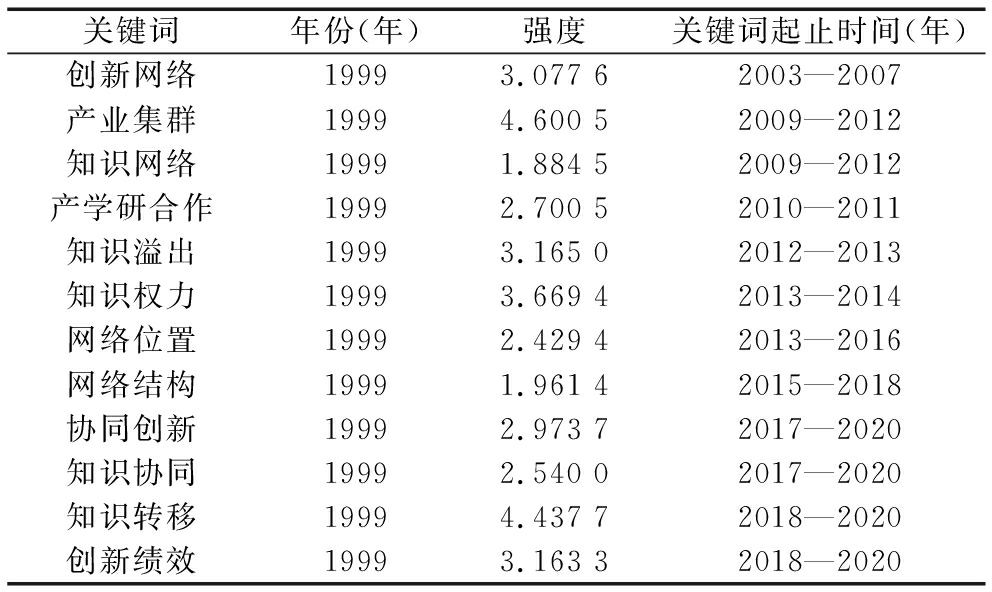 关键词年份(年)强度关键词起止时间(年)创新网络19993.077 62003—2007产业集群19994.600 52009—2012知识网络19991.884 52009—2012产学研合作19992.700 52010—2011知识溢出19993.165 02012—2013知识权力19993.669 42013—2014网络位置19992.429 42013—2016网络结构19991.961 42015—2018协同创新19992.973 72017—2020知识协同19992.540 02017—2020知识转移19994.437 72018—2020创新绩效19993.163 32018—2020