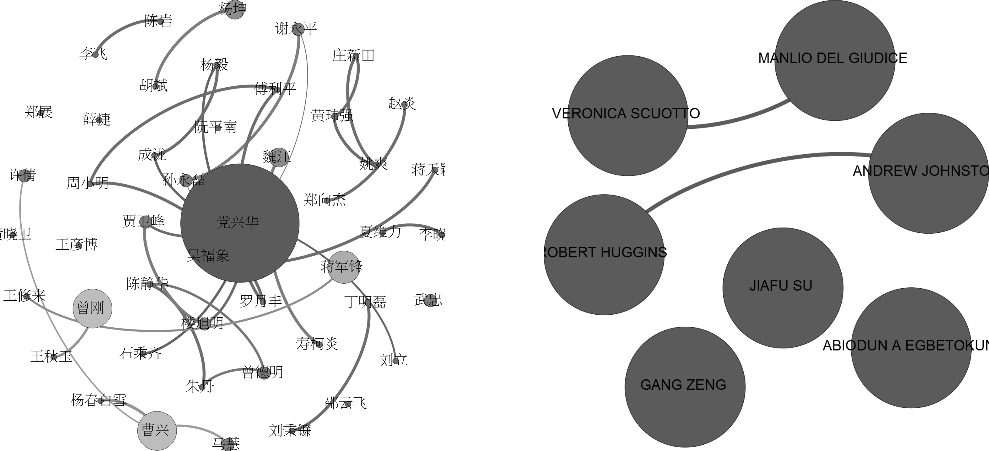 本文通过Citespace软件绘制知识主题研究的中外作者合作网络图谱(见图 2、3)。可以看出,在创新网络领域的知识主题研究中,国内学者合作次数多、联系密切,形成以党兴华、曾刚、曹兴、蒋军锋等人为核心的多个研究团队。其中,以西安理工大学党兴华教授为核心的研究团队是国内创新网络研究领域的领军团队,共发表CSSCI文章83篇(知识主题文章25篇),其中有60篇(知识主题文章19篇)发表在国家自然科学基金委员会认定的管理科学重要学术期刊上,可谓是量大质优。在具体研究内容上,涉及创新网络嵌入、网络治理、网络惯例、网络耦合、网络分裂与子群、创新网络知识要素等诸多方面。其中,创新网络领域知识主题研究涉及知识基、知识测度、知识流动、知识权力、知识共享、知识能力等多个分支内容。观察国外作者合作网络发现,虽然国外研究起步早于我国,但在创新网络知识主题研究上,作者之间合作很少,并未形成具有代表性的核心研究团队。