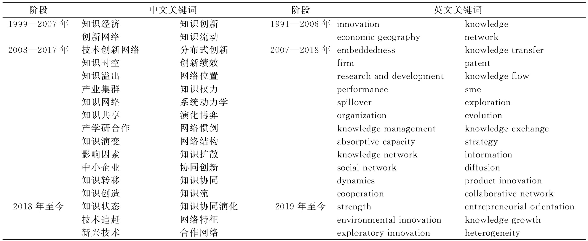 阶段中文关键词阶段英文关键词1999—2007年知识经济知识创新1991—2006年innovationknowledge创新网络知识流动economic geographynetwork2008—2017年技术创新网络分布式创新2007—2018年embeddednessknowledge transfer知识时空创新绩效firmpatent知识溢出网络位置research and developmentknowledge flow产业集群知识权力performancesme知识网络系统动力学spilloverexploration知识共享演化博弈organizationevolution产学研合作网络惯例knowledge managementknowledge exchange知识演变网络结构absorptive capacitystrategy影响因素知识扩散knowledge networkinformation中小企业协同创新social networkdiffusion知识转移知识协同dynamicsproduct innovation知识创造知识流cooperationcollaborative network2018年至今知识状态知识协同演化2019年至今strengthentrepreneurial orientation技术追赶网络特征environmental innovationknowledge growth新兴技术合作网络exploratory innovationheterogeneity