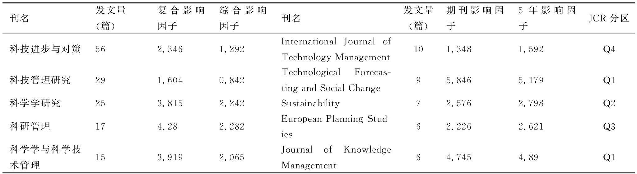 刊名发文量(篇)复合影响因子综合影响因子刊名发文量(篇)期刊影响因子5年影响因子JCR分区科技进步与对策562.3461.292International Journal of Technology Management101.3481.592Q4科技管理研究291.6040.842Technological Forecas-ting and Social Change 95.8465.179Q1科学学研究253.8152.242Sustainability72.5762.798Q2科研管理174.282.282European Planning Stud-ies62.2262.621Q3科学学与科学技术管理153.9192.065Journal of Knowledge Management64.7454.89Q1