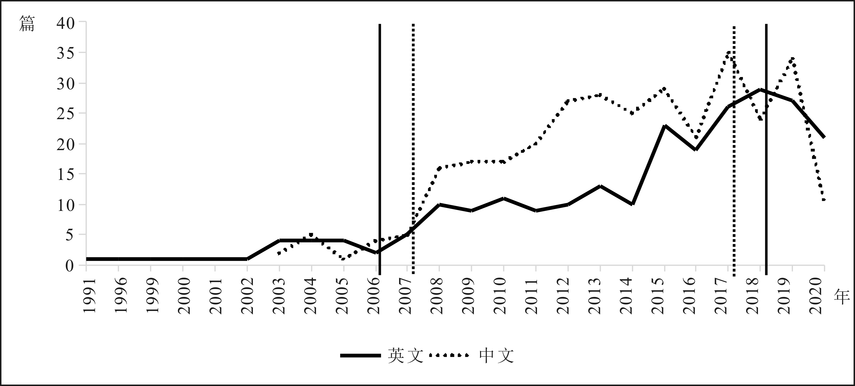 从文献发表数量看,创新网络领域知识主题研究发文量变化大致呈现先缓慢增长、后快速增长、再降低的变化趋势(见图1)。相较国内学者,国外学者较早涉足知识主题研究,且发文数量变化趋势较为稳定。在发展阶段上,图中两条竖实线分别以2006年和2018年为时间节点,将英文发文数量变化趋势分成3个阶段;两条竖虚线则分别以2007年和2017年为时间节点,将中文发文量变化趋势分成3个阶段。可以看出,中外文发文数量在各自第一个时间节点前均呈缓慢增长趋势;进入第二阶段,发文量在波动中不断增长并达到峰值;在第二阶段峰值后,两者均呈现出下降趋势。