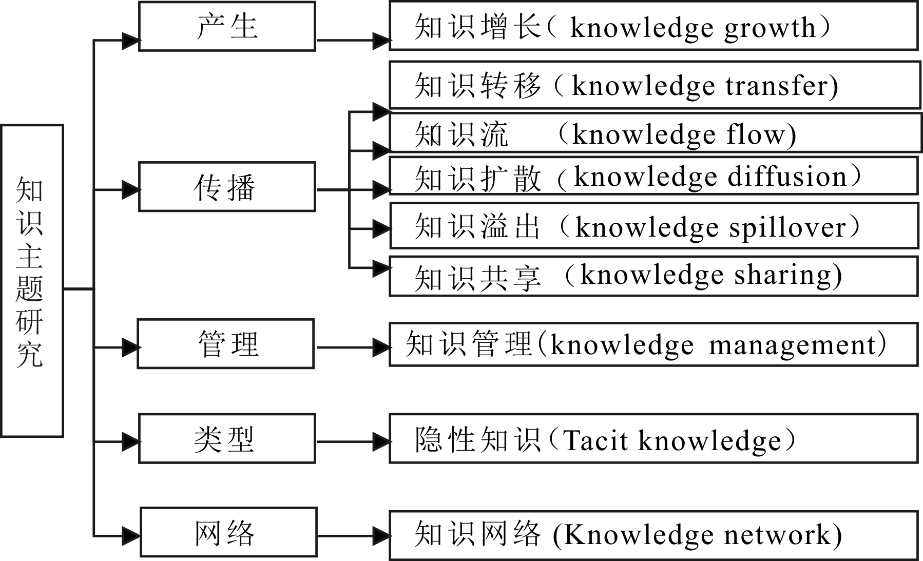 除上文已提及的共同关注主题外,国内学者还对知识权力、知识时空、知识演变等内容进行了深入研究。知识权力一词源于社会学领域,由Michel[25]基于社会学视角构建,其认为科学知识与权力融为一体,知识是获取权力的手段,是权力萌生的内因,应用知识的过程就是行使权力的过程。虽然其由国外学者提出,但更受国内学者青睐,如徐可等[26]探讨技术创新网络知识权力、结构权力对网络惯例的影响;吉迎东等[27]基于知识权力非对称视角研究技术创新网络中的知识共享行为机理。知识时空是基于当代物理学视角察看技术创新过程中行为主体知识之间的信息交流过程,主体间物料流动、资金流动、人员流动和消息流动必定与熵的增加/减少相联系,因而可以用信息流动刻画主体间的相互作用,技术创新网络因此构成一定时空中的信息场,行为主体知识则可被视为该信息场中具有自身结构特征的特定局部,并因结构不同可以相互识别,这种信息场的局部就可以理解为知识时空(蒋军锋,2012)。知识演变是从时间视角出发,将创新网络扩张与核心企业成长之间的交互作用理解为基于知识演变的技术—制度共生演变过程[28],这种共生演变是知识交互影响的结果,复杂技术的产生也是以具有独特时空动态的知识为基础的[29]。综上可知,国内外学者对于知识主题的研究既有相同点也有不同点,两者应相互借鉴,为创新及其中知识主题研究奠定基础。