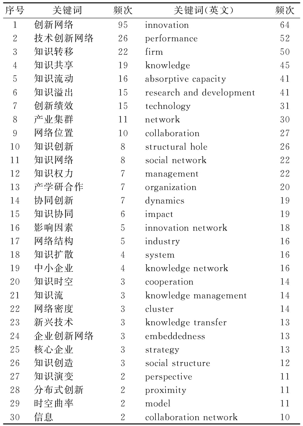 表4 国内外知识主题研究文献高频关键词(TOP30)