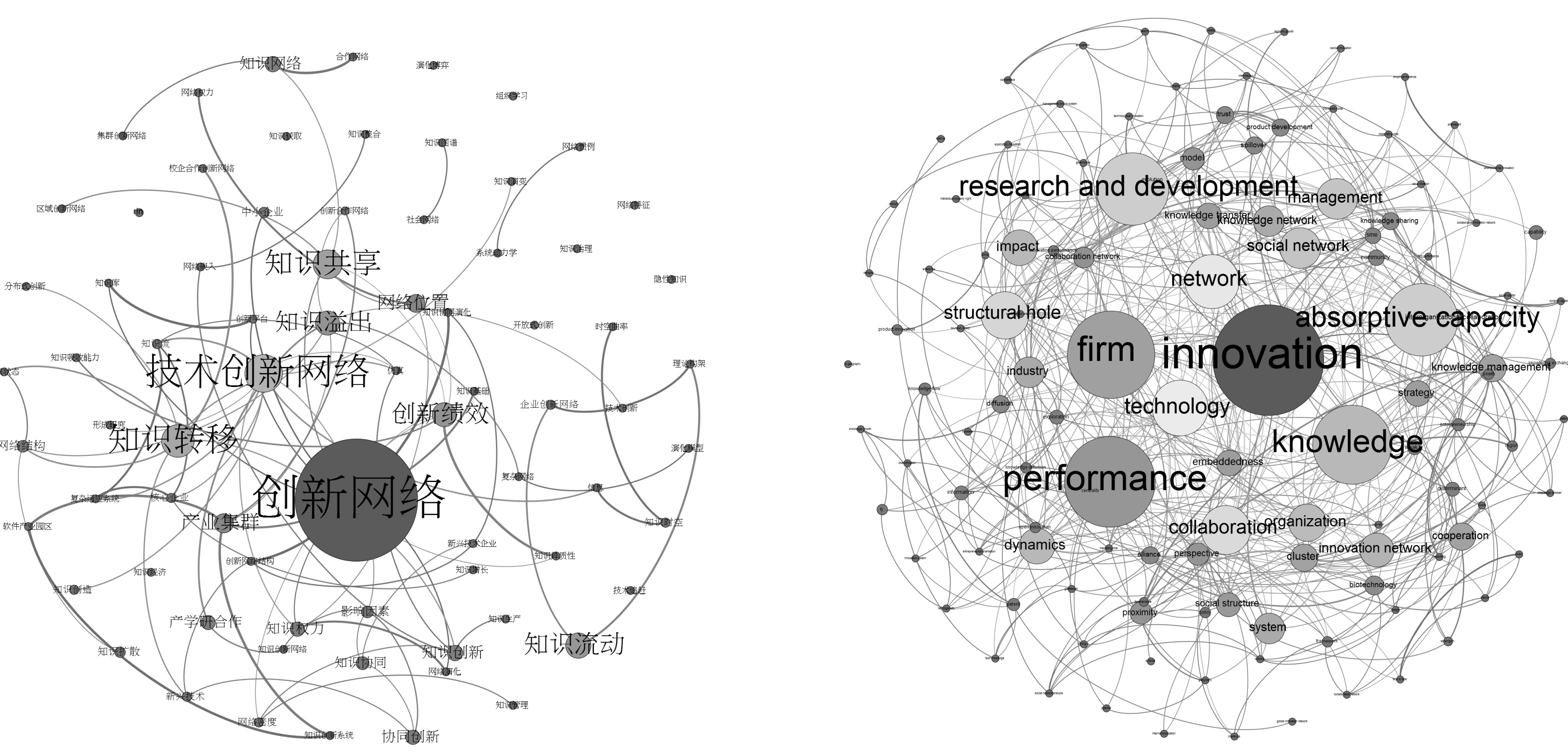 第二阶段(2007—2018年):与国内研究一样,国外创新网络及其中知识主题研究在该阶段也进入快速发展期。创新网络的横向扩散研究与国内情况基本一致,逐步开始对全球创新网络(global innovation network)、协同创新网络(collaborative innovation network)等不同类型网络进行研究;在纵向探索上,国外研究同样涉及到创新绩效(innovation performance)、网络属性(嵌入性(embeddedness)、中心性(centrality)等)、网络主体(企业(firm)、中小企业(SME)等)、新的创新模式(突破性创新(radical innovation)、开放式创新(open innovation))等内容。中外研究虽有相同之处,但比较分析发现,国外学者在创新网络横向扩散研究上的关注度低于国内学者,并未提出多种类型创新网络;在纵向探索分析上,国外学者在关注点和研究视角丰富性上高于国内学者,除上述研究问题外, 社交网络(social network)、价值创造(value creation)、产品创新( product innovation)、创新体系(innovation system)等内容也受到国外学者青睐。在创新网络知识主题研究上,国外学者同样对知识管理(knowledge management)、知识共享(knowledge sharing)、知识转移(knowledge transfer)、隐性知识(tacit knowledge)等进行了深入研究。此外,与国内研究不同的是,国外学者还对知识交流(knowledge exchange)、知识产权(intellectual property right)等问题展开了研究。