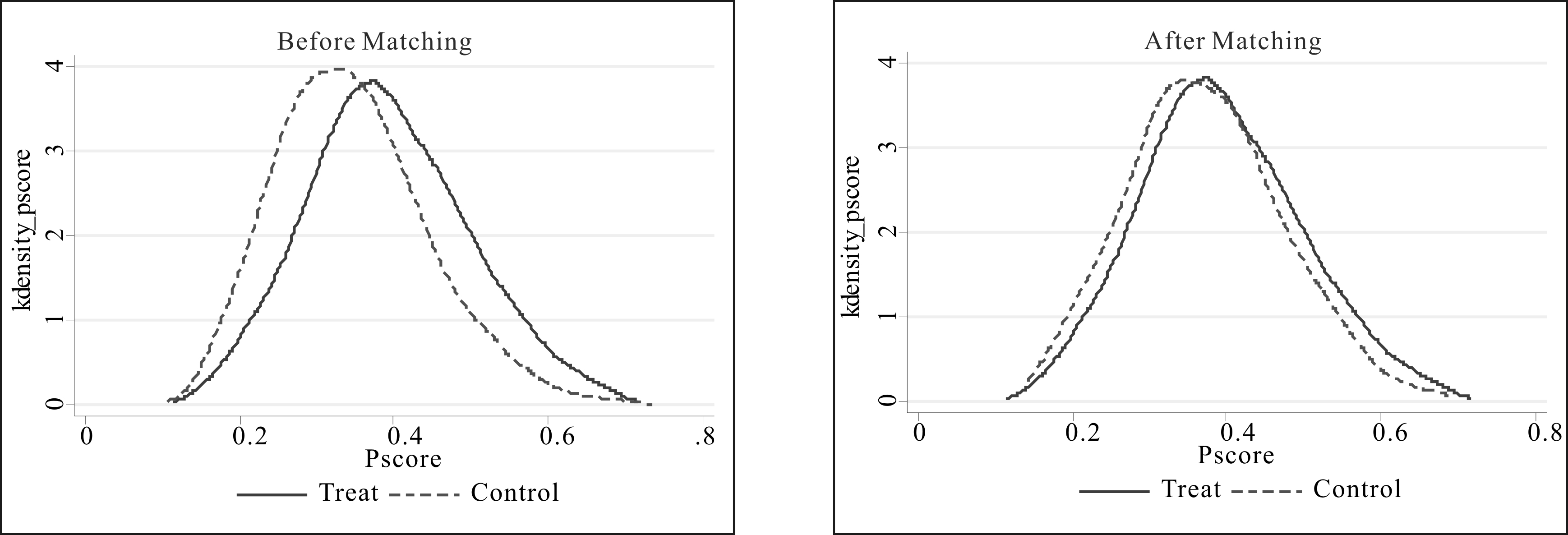 图2 PSM匹配前后被国有股权参股的处理组与控制组的倾向得分概率分布