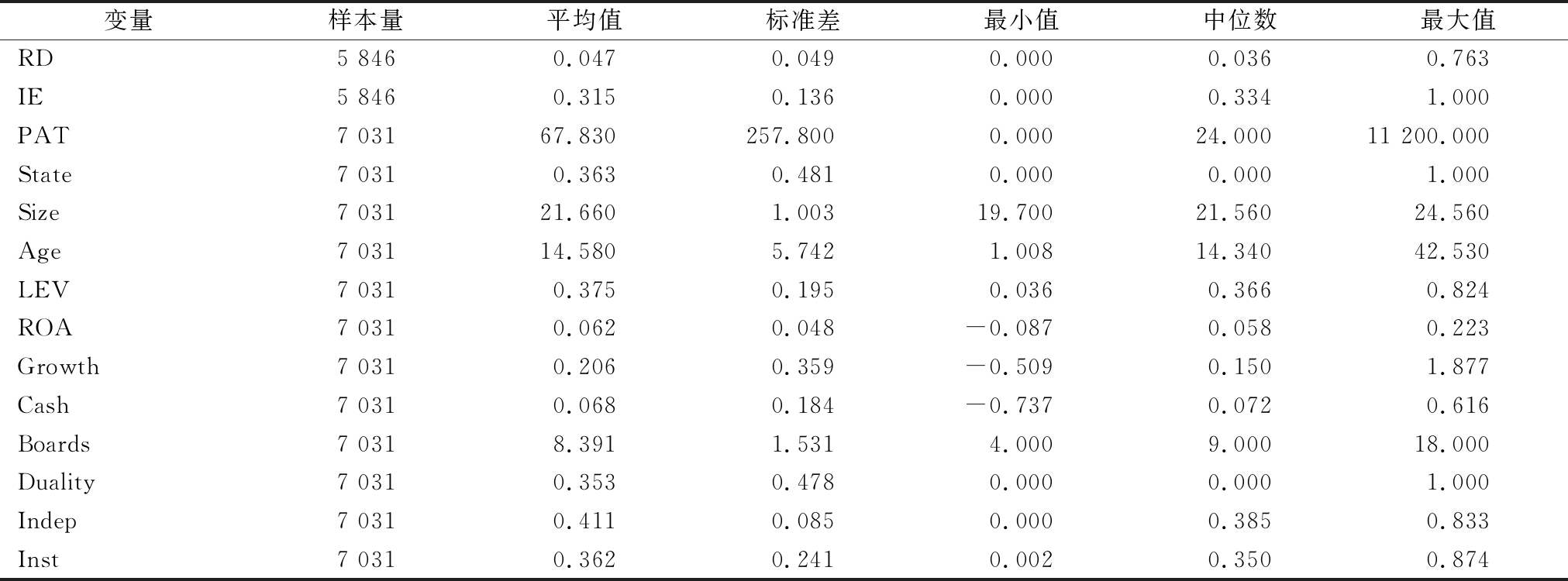 变量样本量平均值标准差最小值中位数最大值RD58460.0470.0490.0000.0360.763IE58460.3150.1360.0000.3341.000PAT703167.830257.8000.00024.00011200.000State70310.3630.4810.0000.0001.000Size703121.6601.00319.70021.56024.560Age703114.5805.7421.00814.34042.530LEV70310.3750.1950.0360.3660.824ROA70310.0620.048-0.0870.0580.223Growth70310.2060.359-0.5090.1501.877Cash70310.0680.184-0.7370.0720.616Boards70318.3911.5314.0009.00018.000Duality70310.3530.4780.0000.0001.000Indep70310.4110.0850.0000.3850.833Inst70310.3620.2410.0020.3500.874