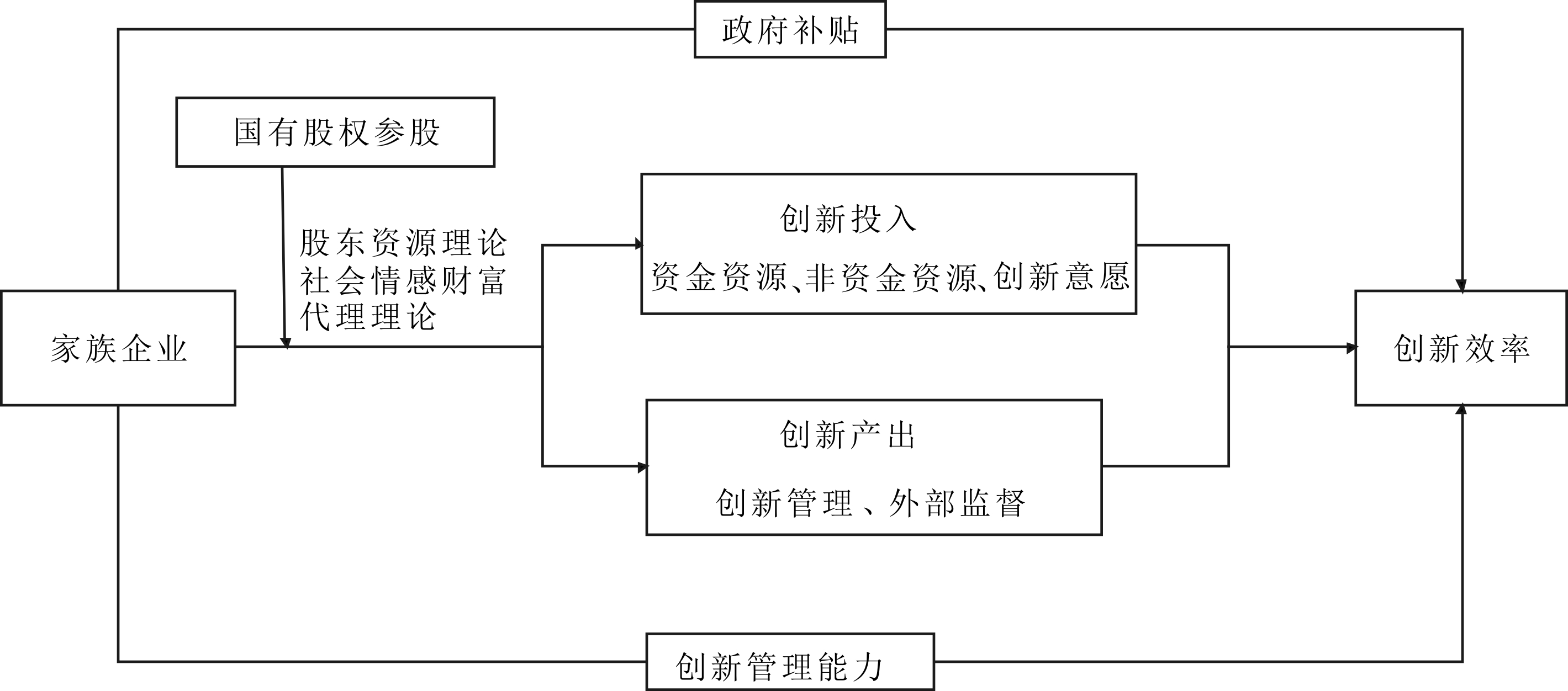 聚焦家族企业,一方面,血缘关系和家族文化使家族企业对控制权的追求更强烈、对家族声誉重视程度更高,为避免承担创新失败导致的社会情感财富损失,家族企业倾向于规避创新[10-11];另一方面,当前学者对家族企业创新的研究大多集中在创新投入层面,较少探讨投入转化效率,基于混合所有制改革宏观背景的研究更少。因此,在当前“国资”参股“民营”背景下,将国有股权作为家族企业创新效率影响因素,探讨混合所有制改革对民企创新效率的影响具有一定现实意义。考虑到非控股国有股权与家族所有权相互融合、交互影响[9]过程,本文深入探讨国有股权参股对家族企业创新效率的作用机理和影响路径,对全面认识混合所有制改革具有重要意义。