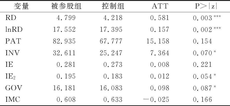 变量被参股组控制组ATTP>|z|RD4.7994.2180.5810.003***lnRD17.55217.3950.1570.002***PAT82.93567.77715.1580.154INV32.61125.2477.3640.070*IE0.2810.2730.0080.221IE20.1950.1830.0120.054*GOV16.18116.0830.0980.087*IMC0.6080.633-0.0250.166