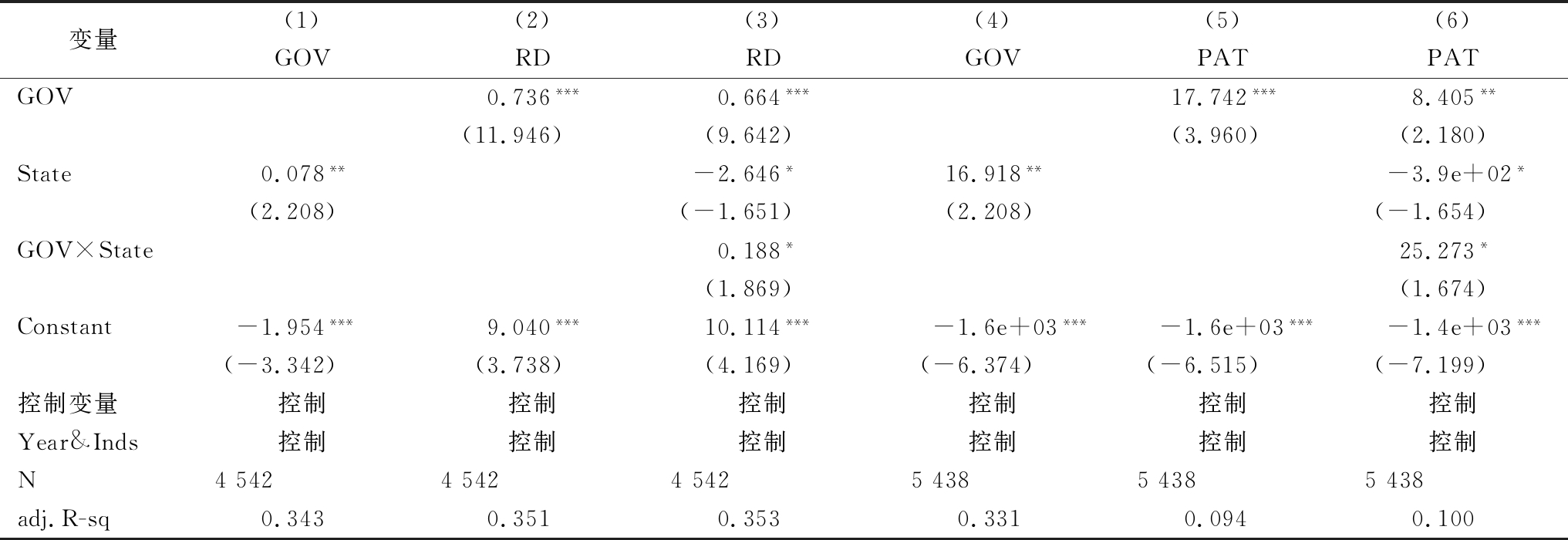 变量(1)(2)(3)(4)(5)(6)GOVRDRDGOVPATPATGOV0.736***0.664***17.742***8.405**(11.946)(9.642)(3.960)(2.180)State0.078**-2.646*16.918**-3.9e+02*(2.208)(-1.651)(2.208)(-1.654)GOV×State0.188*25.273*(1.869)(1.674)Constant-1.954***9.040***10.114***-1.6e+03***-1.6e+03***-1.4e+03***(-3.342)(3.738)(4.169)(-6.374)(-6.515)(-7.199)控制变量控制控制控制控制控制控制Year&Inds控制控制控制控制控制控制N454245424542543854385438adj.R-sq0.3430.3510.3530.3310.0940.100
