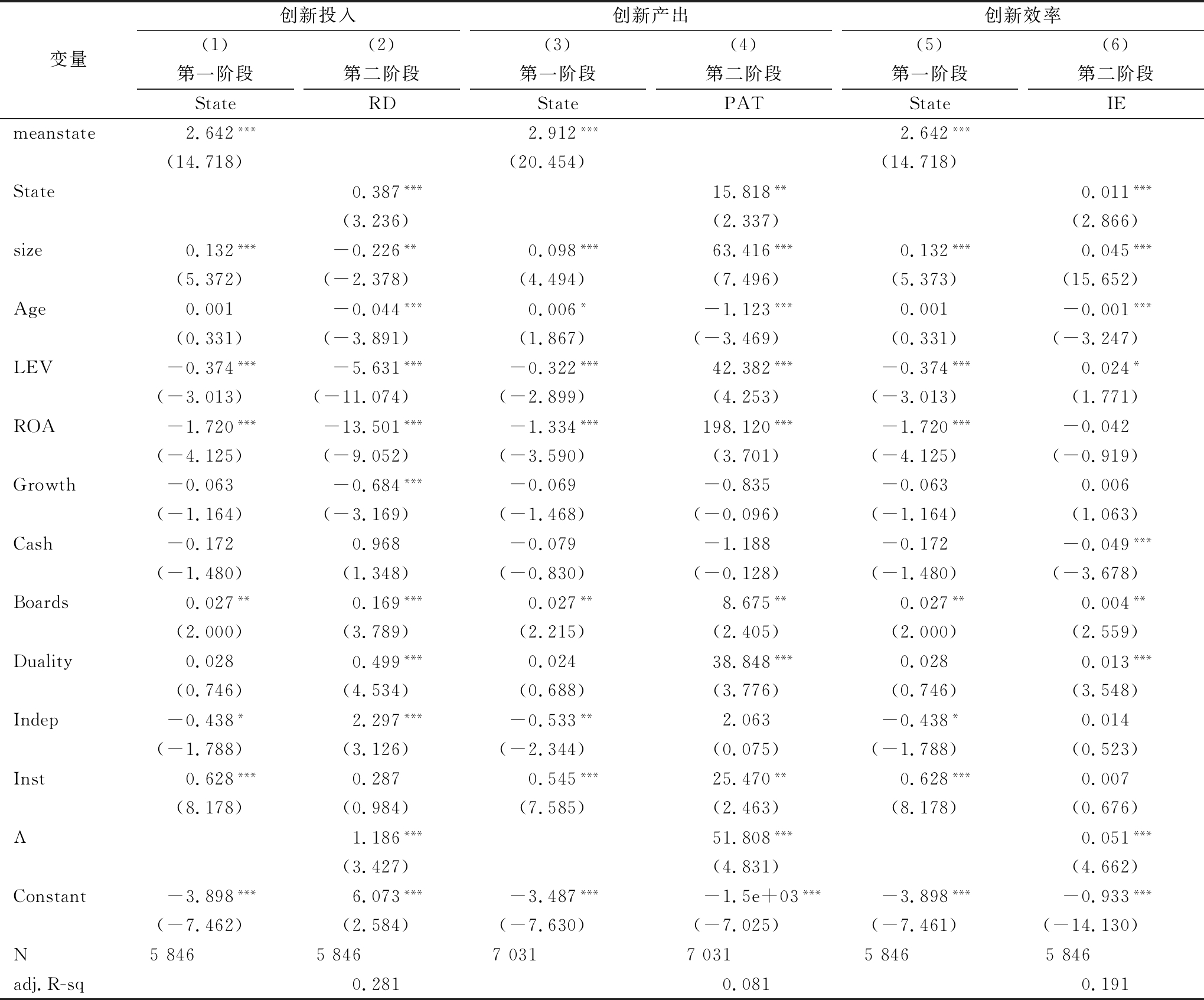 变量创新投入(1)第一阶段State(2)第二阶段RD创新产出(3)第一阶段State(4)第二阶段PAT创新效率(5)第一阶段State(6)第二阶段IEmeanstate2.642***2.912***2.642***(14.718)(20.454)(14.718)State0.387***15.818**0.011***(3.236)(2.337)(2.866)size0.132***-0.226**0.098***63.416***0.132***0.045***(5.372)(-2.378)(4.494)(7.496)(5.373)(15.652)Age0.001-0.044***0.006*-1.123***0.001-0.001***(0.331)(-3.891)(1.867)(-3.469)(0.331)(-3.247)LEV-0.374***-5.631***-0.322***42.382***-0.374***0.024*(-3.013)(-11.074)(-2.899)(4.253)(-3.013)(1.771)ROA-1.720***-13.501***-1.334***198.120***-1.720***-0.042(-4.125)(-9.052)(-3.590)(3.701)(-4.125)(-0.919)Growth-0.063-0.684***-0.069-0.835-0.0630.006(-1.164)(-3.169)(-1.468)(-0.096)(-1.164)(1.063)Cash-0.1720.968-0.079-1.188-0.172-0.049***(-1.480)(1.348)(-0.830)(-0.128)(-1.480)(-3.678)Boards0.027**0.169***0.027**8.675**0.027**0.004**(2.000)(3.789)(2.215)(2.405)(2.000)(2.559)Duality0.0280.499***0.02438.848***0.0280.013***(0.746)(4.534)(0.688)(3.776)(0.746)(3.548)Indep-0.438*2.297***-0.533**2.063-0.438*0.014(-1.788)(3.126)(-2.344)(0.075)(-1.788)(0.523)Inst0.628***0.2870.545***25.470**0.628***0.007(8.178)(0.984)(7.585)(2.463)(8.178)(0.676)Λ1.186***51.808***0.051***(3.427)(4.831)(4.662)Constant-3.898***6.073***-3.487***-1.5e+03***-3.898***-0.933***(-7.462)(2.584)(-7.630)(-7.025)(-7.461)(-14.130)N584658467031703158465846adj.R-sq0.2810.0810.191