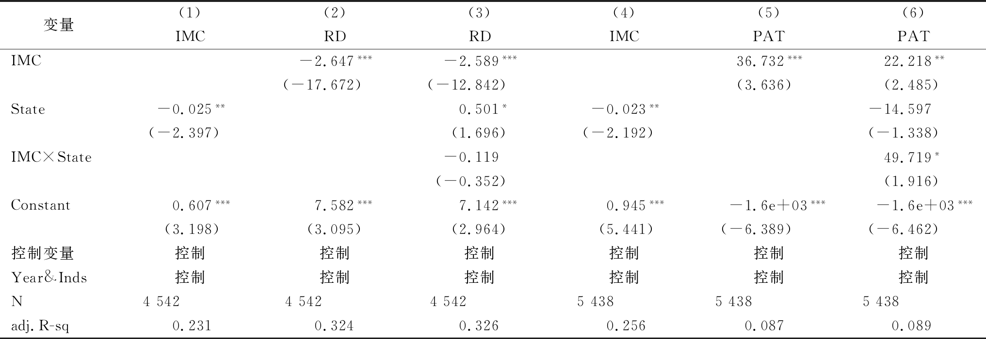 变量(1)(2)(3)(4)(5)(6)IMCRDRDIMCPATPATIMC-2.647***-2.589***36.732***22.218**(-17.672)(-12.842)(3.636)(2.485)State-0.025**0.501*-0.023**-14.597(-2.397)(1.696)(-2.192)(-1.338)IMC×State-0.11949.719*(-0.352)(1.916)Constant0.607***7.582***7.142***0.945***-1.6e+03***-1.6e+03***(3.198)(3.095)(2.964)(5.441)(-6.389)(-6.462)控制变量控制控制控制控制控制控制Year&Inds控制控制控制控制控制控制N454245424542543854385438adj.R-sq0.2310.3240.3260.2560.0870.089