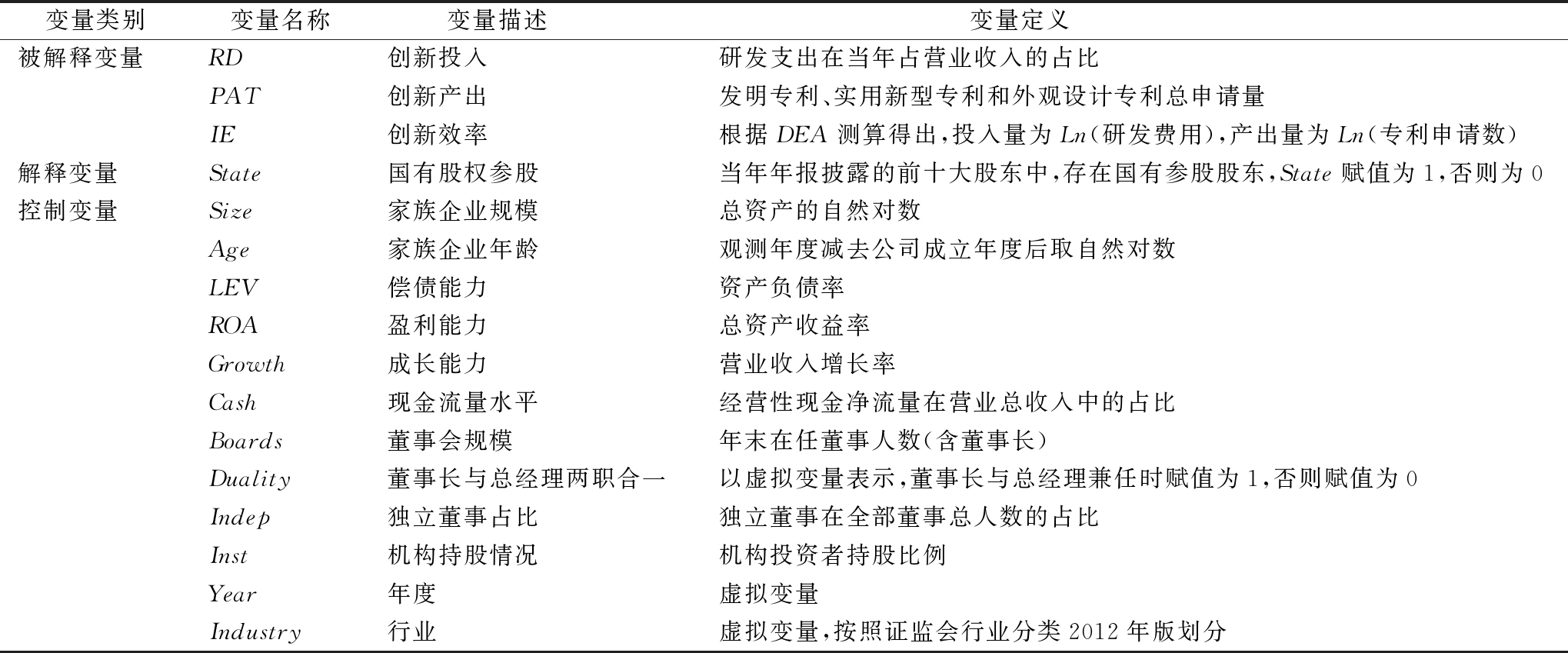 变量类别变量名称变量描述 变量定义 被解释变量RD创新投入研发支出在当年占营业收入的占比PAT创新产出发明专利、实用新型专利和外观设计专利总申请量IE创新效率根据DEA测算得出,投入量为Ln(研发费用),产出量为Ln(专利申请数)解释变量State国有股权参股当年年报披露的前十大股东中,存在国有参股股东,State赋值为1,否则为0控制变量Size家族企业规模总资产的自然对数Age家族企业年龄观测年度减去公司成立年度后取自然对数LEV偿债能力资产负债率ROA盈利能力总资产收益率Growth成长能力营业收入增长率Cash现金流量水平经营性现金净流量在营业总收入中的占比Boards董事会规模年末在任董事人数(含董事长)Duality董事长与总经理两职合一以虚拟变量表示,董事长与总经理兼任时赋值为1,否则赋值为0Indep独立董事占比独立董事在全部董事总人数的占比Inst机构持股情况机构投资者持股比例Year年度虚拟变量Industry行业虚拟变量,按照证监会行业分类2012年版划分