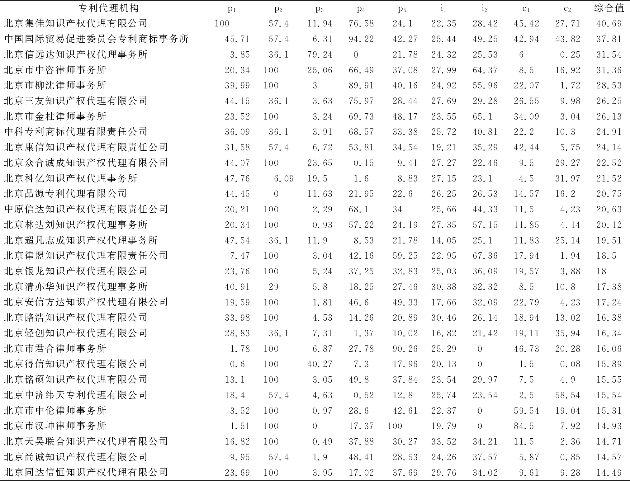 (1)综合指标评价分析。基于上文得到的各个指标权重,可依次算出每家专利代理机构二级指标评价值及相应综合评价值。如表3所示,仅列出了综合值排名前30位专利代理机构。