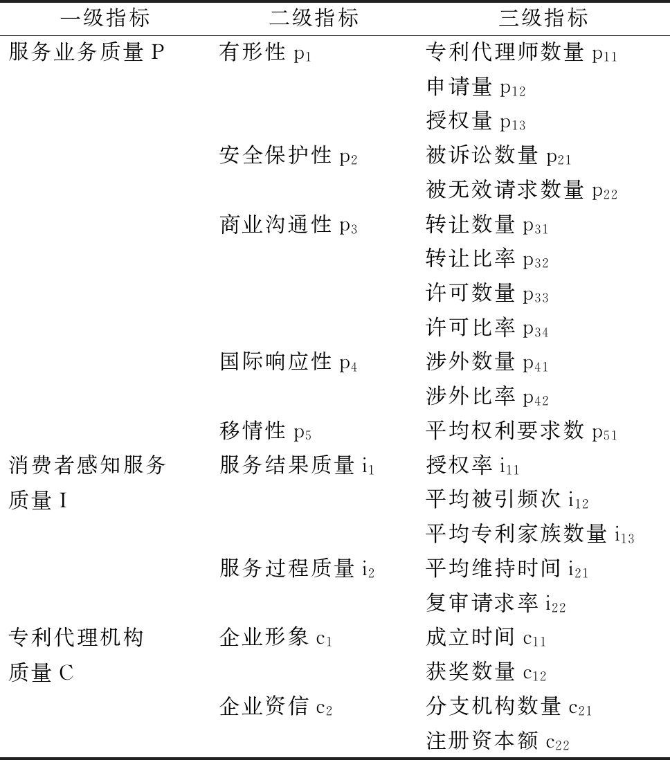 一级指标二级指标三级指标服务业务质量P有形性p1专利代理师数量p11申请量p12授权量p13安全保护性p2被诉讼数量p21被无效请求数量p22商业沟通性p3转让数量p31转让比率p32许可数量p33许可比率p34国际响应性p4涉外数量p41涉外比率p42移情性p5平均权利要求数p51消费者感知服务质量I服务结果质量i1授权率i11平均被引频次i12平均专利家族数量i13服务过程质量i2平均维持时间i21复审请求率i22专利代理机构质量C企业形象c1成立时间c11获奖数量c12企业资信c2分支机构数量c21注册资本额c22