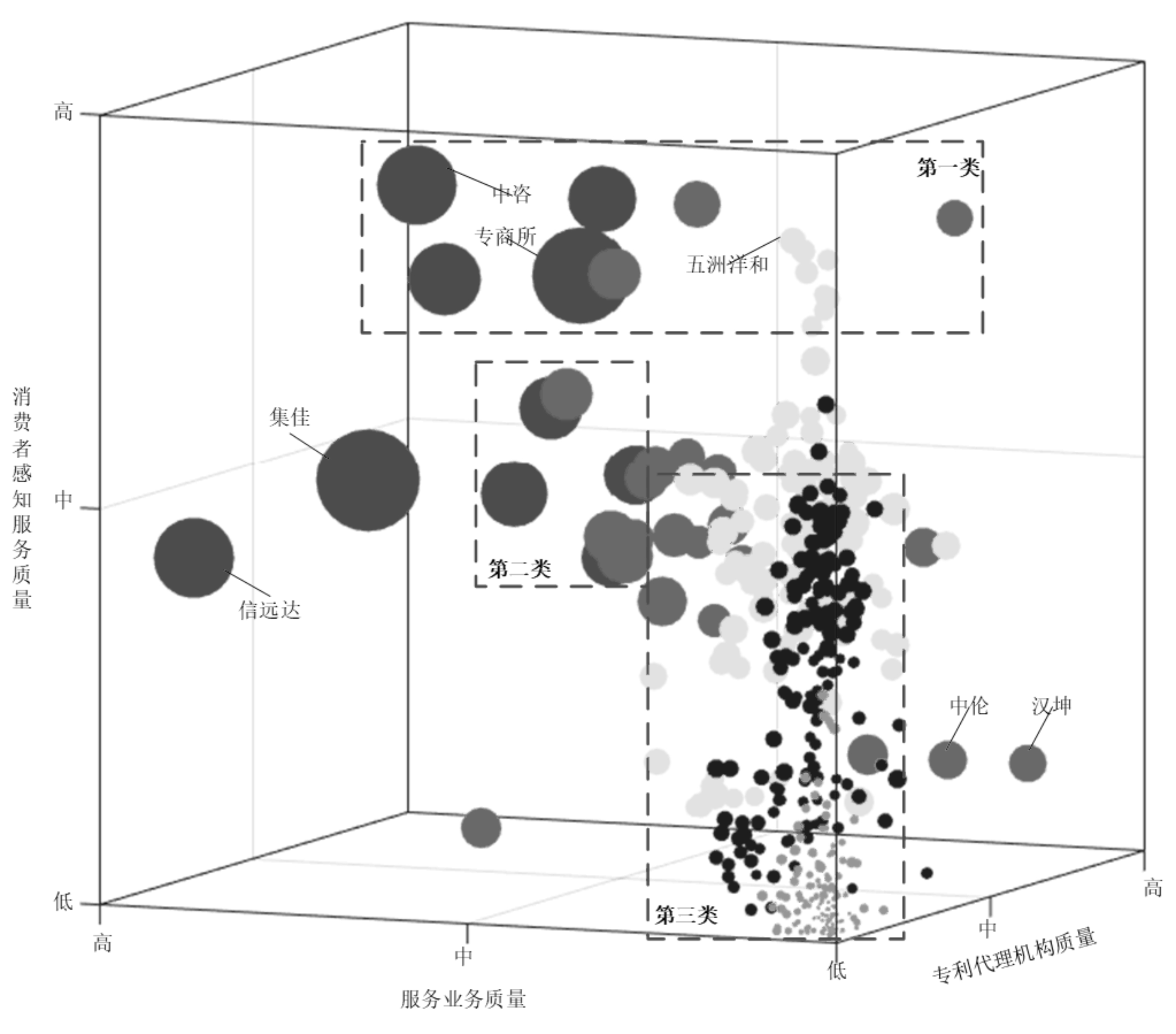 依据图1,可以将北京地区的专利代理机构划分为3个聚类:①第一类为在消费者感知服务质量分指标上具有较高评分的代理机构,主要由综合评分前两级的代理机构组成,其中也有部分第三级代理机构。此类代理机构主要凭借为客户提供安心的服务过程和良好服务态度,使自身在行业中获得竞争力。进一步分析可知,以五洲洋和为代表的第三级代理机构在消费者感知服务质量分指标上有较高评分,而在其它两个分指标上的得分都不高,致使其综合评分值不高。而以专商所和中咨为代表的代理机构除在消费者感知服务质量分指标上有较高评分外,其它两个分指标的评分也都处于中上等水平,得到了较高综合评分;②第二类是在3个分指标上均具有中等评分的代理机构,主要由综合评分前两级的代理机构构成。它们试图开拓并发展自身在各个方向和领域的能力,全面提升业务水平,使自身在行业竞争中获得有利地位。此类代理机构有较大发展潜力,当前也普遍具备较高综合评分;③第三类则在3个分指标的评分均处于中低水平,主要由综合评分排名靠后的第三级代理机构组成。此类代理机构没有竞争优势,也未找到自身潜在优势。这部分代理机构需要尽快确立一个适合自身发展的方向或业务领域,避免被领先集团进一步拉开差距,同时,逐步提升自身竞争力。