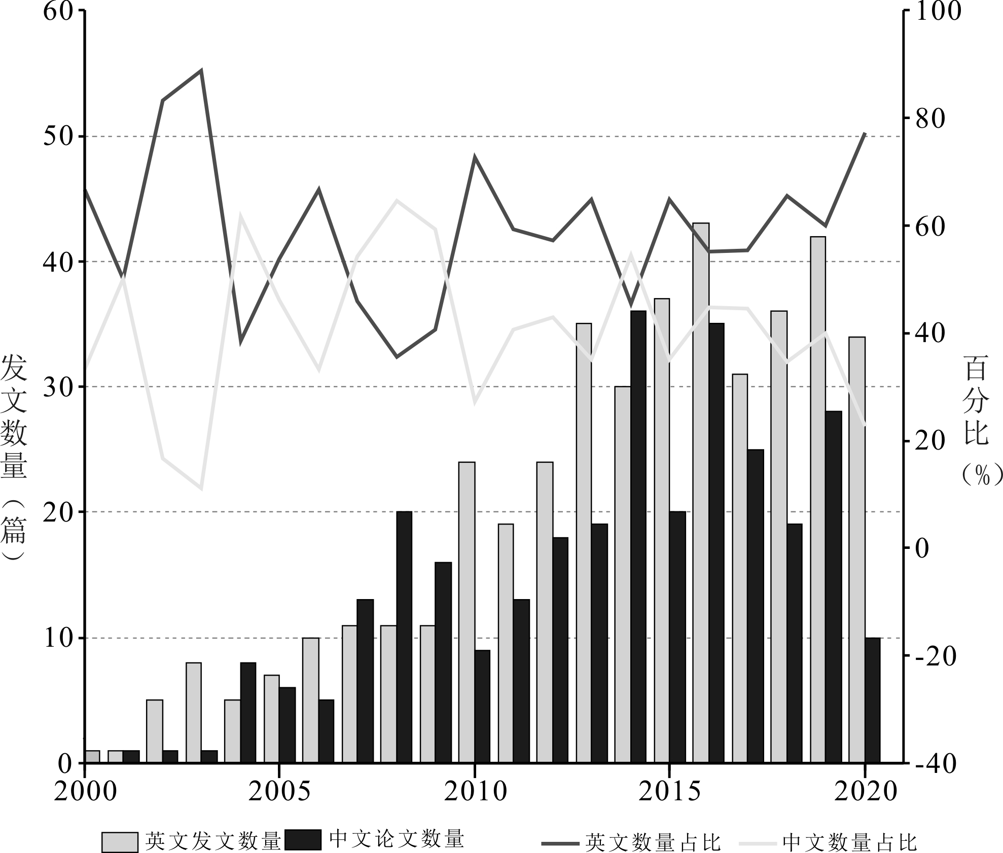 图1为中外专利诉讼发文量趋势图。可以发现,专利诉讼领域相关外文文献数量在2013年之前总体保持上升趋势,而从2013年开始,外文文献数量开始趋于缓和、稳定,每年保持在30余篇;国内专利诉讼研究起步较晚,2003年之前每年发表论文不超过1篇,从2004年开始每年超过5篇,在2014年达到最高的36篇,且近10年每年发表数量均低于国外。整体而言,我国专利诉讼研究领域高质量论文数量相对较少,一方面是因为我国专利诉讼、知识产权保护等相关制度和政策较为滞后,导致国内相关研究较少;另一方面,近年来,随着我国学术国际化程度提升,出现部分国内学者开始将专利诉讼论文发表至国际期刊的情形。
