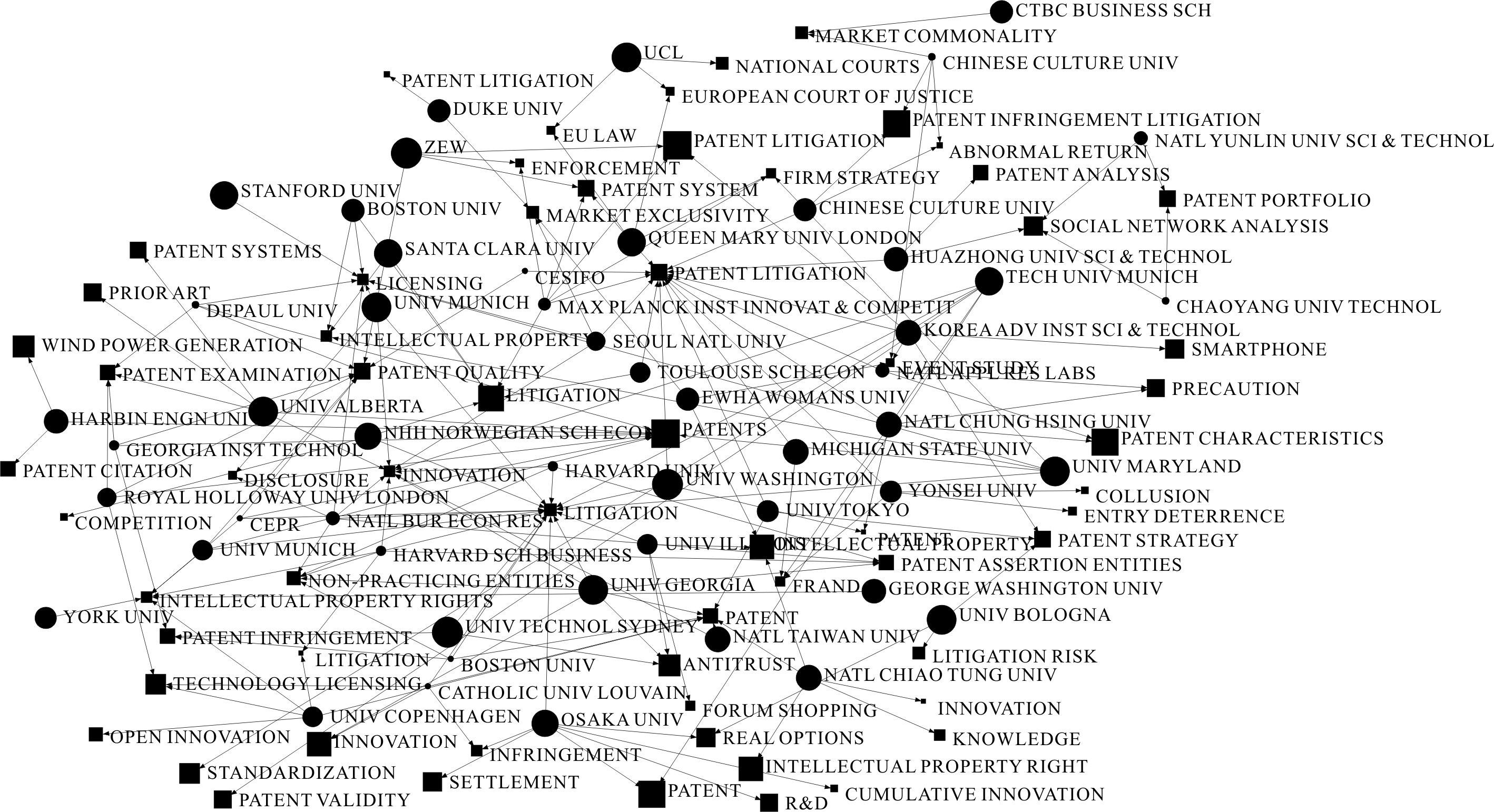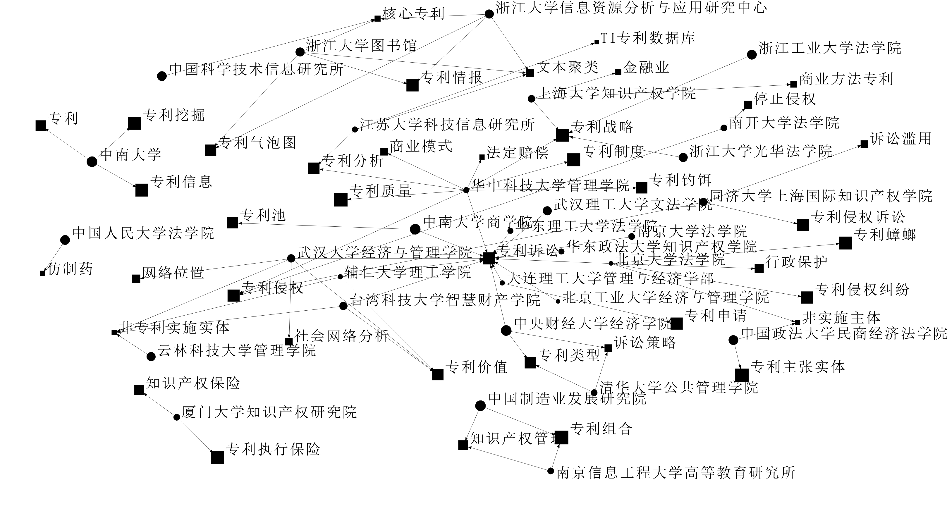 提取样本中的国内外关键词和作者所属机构,处理后得到关键词—机构分布矩阵(关键词—期刊二模矩阵),采用UCINET制作关键词—机构共现图谱(见图3、4)。可以看出,国外机构关注点差异较小,而国内机构关注的专利诉讼具体研究方向各异,如华中科技大学管理学院更加关注法定赔偿、专利分析、专利战略和商业模式等,北京大学法学院较为关注专利蟑螂、专利侵权纠纷和行政保护等,中国政法大学民商经济法学院较为关注非实施主体和专利主张实体,同济大学上海国际知识产权学院关注重点为诉讼滥用和专利侵权。总体而言,国内研究机构之间关注的专利诉讼具体议题各异,共性较少,各机构之间具有一定研究壁垒。