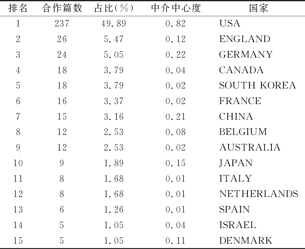 排名合作篇数占比(%)中介中心度国家123749.890.82USA2265.470.12ENGLAND3245.050.22GERMANY4183.790.04CANADA5183.790.02SOUTHKOREA6163.370.02FRANCE7153.160.21CHINA8122.530.08BELGIUM9122.530.02AUSTRALIA1091.890.15JAPAN1181.680.01ITALY1281.680.01NETHERLANDS1361.260.01SPAIN1451.050.04ISRAEL1551.050.11DENMARK