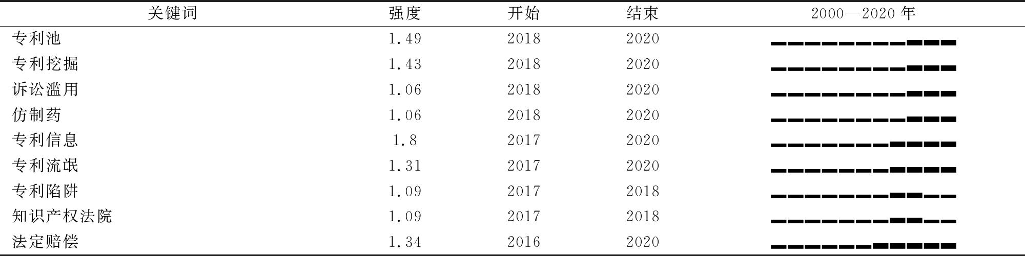 关键词强度开始结束2000—2020年专利池1.4920182020▂▂▂▂▂▂▂▂▃▃▃专利挖掘1.4320182020▂▂▂▂▂▂▂▂▃▃▃诉讼滥用1.0620182020▂▂▂▂▂▂▂▂▃▃▃仿制药1.0620182020▂▂▂▂▂▂▂▂▃▃▃专利信息1.820172020▂▂▂▂▂▂▂▃▃▃▃专利流氓1.3120172020▂▂▂▂▂▂▂▃▃▃▃专利陷阱1.0920172018▂▂▂▂▂▂▂▃▃▂▂知识产权法院1.0920172018▂▂▂▂▂▂▂▃▃▂▂法定赔偿1.3420162020▂▂▂▂▂▂▃▃▃▃▃