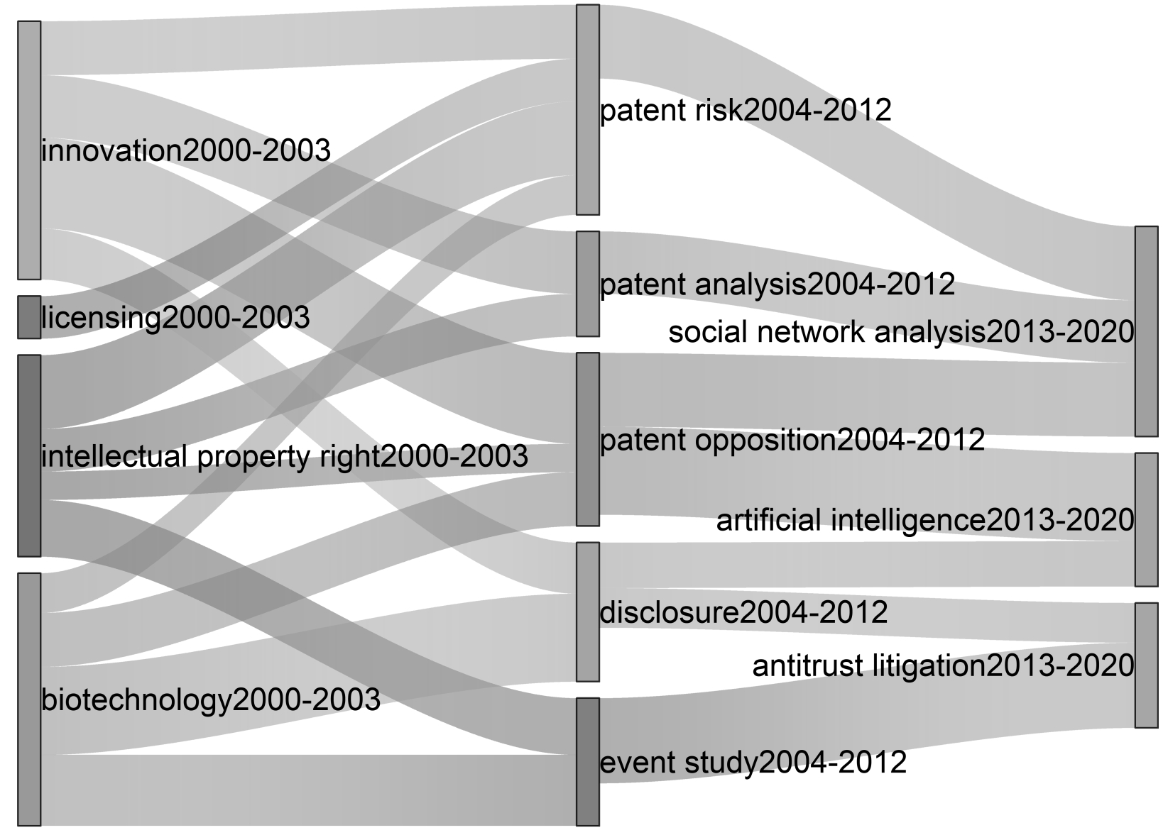 专利诉讼研究热点与前沿一方面需要学界达成某种共识,另一方面也与所在国家整体社会经济发展情况息息相关[8]。类似于知识溢出效应,针对研究领域不同时期出现的关键词绘制关键词时区演变图,能够清晰展现出特定研究领域知识演化轨迹。在关键词演进图中,不同时间段之间的连线数量、连线粗细能够反映该研究领域传承性强弱[9]。本文采用VOSviewer软件绘制国内外专利诉讼关键词共现图谱(见图7、8)。可以看出,在关键词共现图谱中,出现频次较大的节点有专利诉讼(Patent Litigation)、创新(Innovation)、专利战略(Patent Strategy)和非专利实施实体(Non-Practicing Entities)等。为更加直观地展示研究热点的时间分布与相互关系[10],本文基于国内外专利诉讼高被引文献,对不同时间段研究重点进行总结分析,得出国内外专利诉讼主题研究阶段划分及重点,利用R语言编程绘制国内外专利诉讼研究热点演进图(见图9、10)。