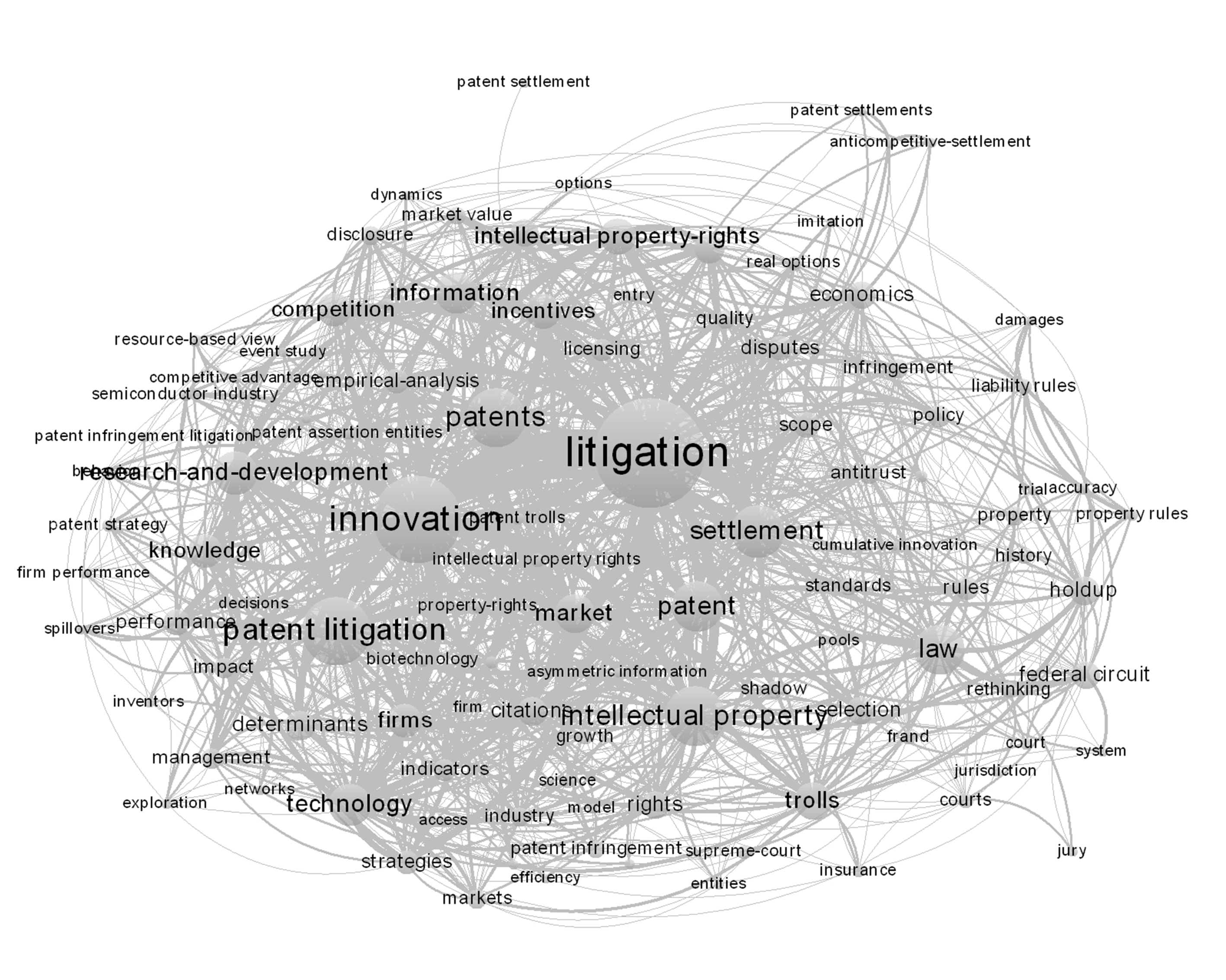 (1)初步发展阶段(2004年之前)。2004年之前,国外专利诉讼研究主题文献数量较少,该阶段主要研究议题为知识产权(Intellectual Property Right)、创新(Innovation)、许可(Licensing)和生物技术(Biotechnology)等,重点关注专利诉讼基本层面的研究。Harhoff &Reitzig[11]通过分析1978—1996年欧洲专利局(EPO)发起的生物技术和药品专利异议程序(EPO发起的专利异议虽然不同于一般民事诉讼流程,但也同样具有较强效用)发现,随着专利价值提升,专利自身被提出异议的可能性也随之增加,尤其在专利较为活跃及技术、市场具有较高不确定性的新技术领域更加频繁。该研究结果对专利及专利诉讼制度设计具有一定启示意义。同时,Arrow[12] 通过研究高科技企业的无形资产配置发现,与其它现金产出活动相比,技术许可缺乏应有的活力,部分原因可能是专利往往在涉及到诉讼程序时才被使用;Lanjouw&Schankerman[13]首次将美国地区法院专利案件备案信息与美国专利商标局详细数据相结合,研究涉诉专利及其所有人特征,发现不同专利间披露的诉讼风险存在显著差异。总体而言,2004年之前,国外专利诉讼研究属于初步发展阶段,主要集中在对专利诉讼的初步探讨上,在研究方法、研究对象上均有待加强。