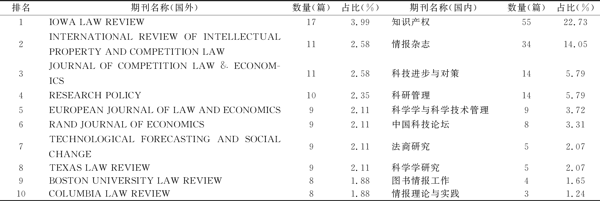 排名期刊名称(国外)数量(篇)占比(%)期刊名称(国内)数量(篇)占比(%)1IOWALAWREVIEW173.99知识产权5522.732INTERNATIONALREVIEWOFINTELLECTUALPROPERTYANDCOMPETITIONLAW112.58情报杂志3414.053JOURNALOFCOMPETITIONLAW&ECONOM-ICS112.58科技进步与对策145.794RESEARCHPOLICY102.35科研管理145.795EUROPEANJOURNALOFLAWANDECONOMICS92.11科学学与科学技术管理93.726RANDJOURNALOFECONOMICS92.11中国科技论坛83.317TECHNOLOGICALFORECASTINGANDSOCIALCHANGE92.11法商研究52.078TEXASLAWREVIEW92.11科学学研究52.079BOSTONUNIVERSITYLAWREVIEW81.88图书情报工作41.6510COLUMBIALAWREVIEW81.88情报理论与实践31.24
