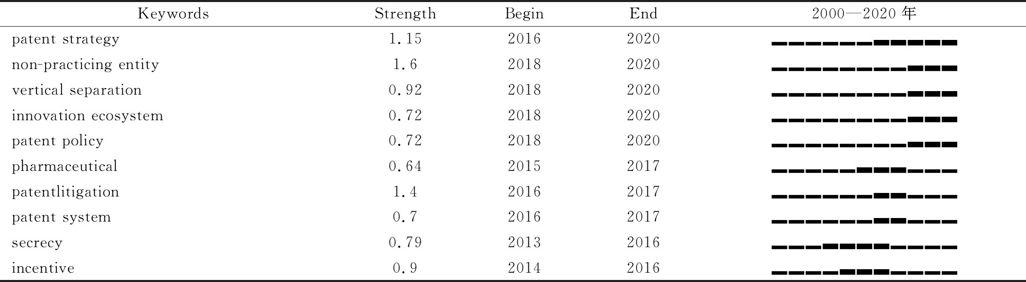 KeywordsStrengthBeginEnd2000—2020年patentstrategy1.1520162020▂▂▂▂▂▂▃▃▃▃▃non-practicingentity1.620182020▂▂▂▂▂▂▂▂▃▃▃verticalseparation0.9220182020▂▂▂▂▂▂▂▂▃▃▃innovationecosystem0.7220182020▂▂▂▂▂▂▂▂▃▃▃patentpolicy0.7220182020▂▂▂▂▂▂▂▂▃▃▃pharmaceutical0.6420152017▂▂▂▂▂▃▃▃▂▂▂patentlitigation1.420162017▂▂▂▂▂▂▃▃▂▂▂patentsystem0.720162017▂▂▂▂▂▂▃▃▂▂▂secrecy0.7920132016▂▂▂▃▃▃▃▂▂▂▂incentive0.920142016▂▂▂▂▃▃▃▂▂▂▂