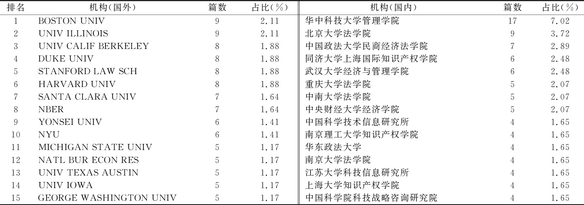 排名机构(国外)篇数占比(%)机构(国内)篇数占比(%)1BOSTONUNIV92.11华中科技大学管理学院177.022UNIVILLINOIS92.11北京大学法学院93.723UNIVCALIFBERKELEY81.88中国政法大学民商经济法学院72.894DUKEUNIV81.88同济大学上海国际知识产权学院62.485STANFORDLAWSCH81.88武汉大学经济与管理学院62.486HARVARDUNIV81.88重庆大学法学院52.077SANTACLARAUNIV71.64中南大学法学院52.078NBER71.64中央财经大学经济学院52.079YONSEIUNIV61.41中国科学技术信息研究所41.6510NYU61.41南京理工大学知识产权学院41.6511MICHIGANSTATEUNIV51.17华东政法大学41.6512NATLBURECONRES51.17南京大学法学院41.6513UNIVTEXASAUSTIN51.17江苏大学科技信息研究所41.6514UNIVIOWA51.17上海大学知识产权学院41.6515GEORGEWASHINGTONUNIV51.17中国科学院科技战略咨询研究院41.65