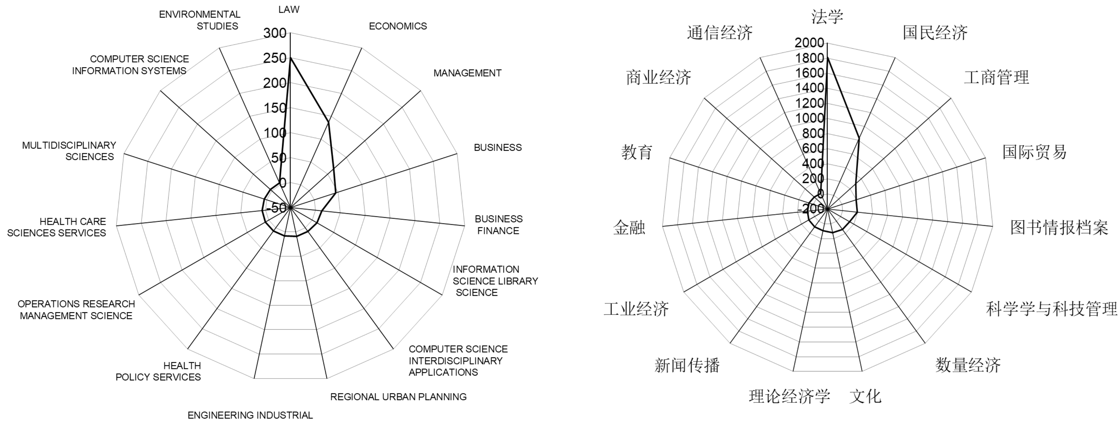 从学科类别分布看(见图5、6),国外专利诉讼主题研究排名前3的类别分别是法学(250篇)、经济学(137篇)和管理学(66篇),国内则是法学(212篇)、科学学与科技管理(68篇)及国民经济(23篇)。值得注意的是,文章与学科类别分布并不是一一对应关系,一篇文章可以同时属于多个学科类别[7]。从国内外专利诉讼学科类别分布看,专利诉讼研究大多集中在法学、经济学和管理学层面,同时也涉及到金融、计算机、医药等学科领域,再次验证了专利诉讼属于交叉学科的研究范畴。