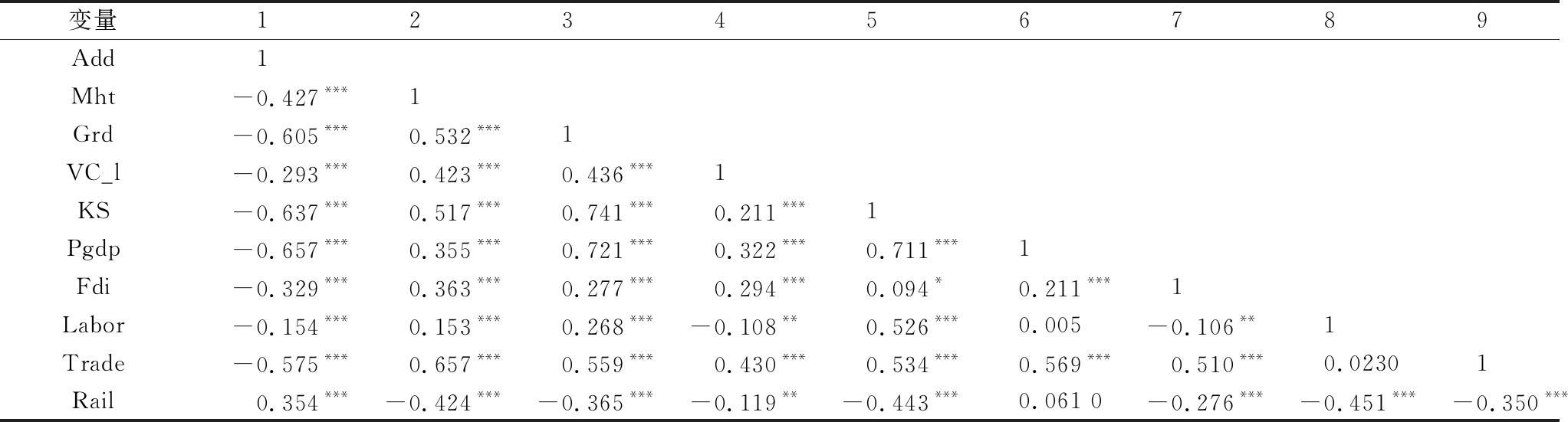 变量123456789Add1 Mht-0.427***1Grd-0.605***0.532***1VC_l-0.293***0.423***0.436***1KS-0.637***0.517***0.741***0.211***1Pgdp-0.657***0.355***0.721***0.322***0.711***1Fdi-0.329***0.363***0.277***0.294***0.094*0.211***1Labor-0.154***0.153***0.268***-0.108**0.526***0.005-0.106**1Trade-0.575***0.657***0.559***0.430***0.534***0.569***0.510***0.02301Rail0.354***-0.424***-0.365***-0.119**-0.443***0.061 0-0.276***-0.451***-0.350***