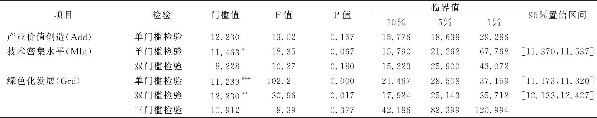 表4为以知识溢出为门限变量的门限效应检验结果,从F值和P值可以看出,知识溢出对产业价值创造的单门限效应不显著,即不存在门槛值;知识溢出对技术密集水平的单门限效应显著,双门限效应不显著,即模型最优门限个数为1,门限估计值为11.463;知识溢出对绿色化发展的单门限效应显著,双门限效应显著,三门限效应不显著,即模型最优门限个数为2,门限估计值分别为11.289和12.230。