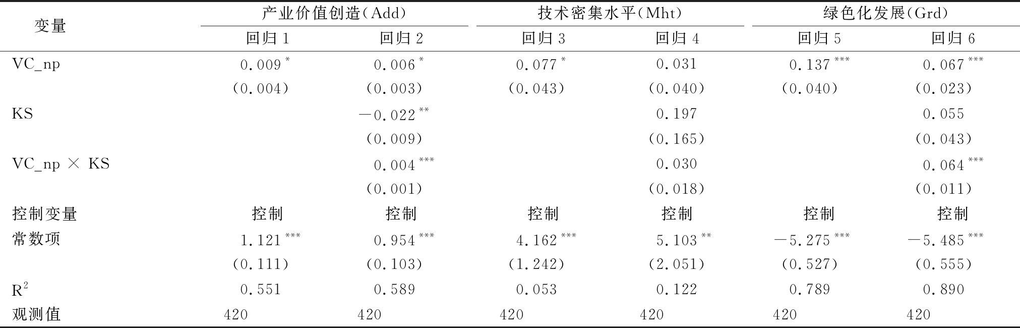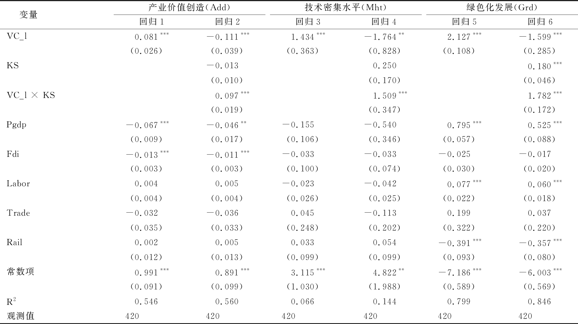 变量产业价值创造(Add)回归1回归2技术密集水平(Mht)回归3回归4绿色化发展(Grd)回归5回归6VC_l0.081***-0.111***1.434***-1.764**2.127***-1.599***(0.026)(0.039)(0.363)(0.828)(0.108)(0.285)KS-0.0130.2500.180***(0.010)(0.170)(0.046)VC_l × KS0.097***1.509***1.782***(0.019)(0.347)(0.172)Pgdp-0.067***-0.046**-0.155-0.5400.795***0.525***(0.009)(0.017)(0.106)(0.346)(0.057)(0.088)Fdi-0.013***-0.011***-0.033-0.033-0.025-0.017(0.003)(0.003)(0.100)(0.074)(0.030)(0.020)Labor0.0040.005-0.023-0.0420.077***0.060***(0.004)(0.004)(0.026)(0.025)(0.022)(0.018)Trade-0.032-0.0360.045-0.1130.1990.037(0.035)(0.033)(0.248)(0.202)(0.322)(0.220)Rail0.0020.0050.0330.054-0.391***-0.357***(0.012)(0.013)(0.099)(0.099)(0.093)(0.080)常数项0.991***0.891***3.115***4.822**-7.186***-6.003***(0.091)(0.099)(1.030)(1.988)(0.589)(0.569)R20.5460.5600.0660.1440.7990.846观测值420420420420420420