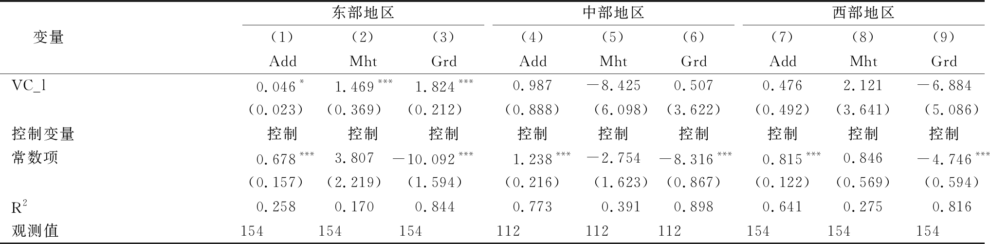 变量东部地区(1)Add(2)Mht(3)Grd中部地区(4)Add(5)Mht(6)Grd西部地区(7)Add(8)Mht(9)GrdVC_l0.046*1.469***1.824***0.987-8.4250.5070.4762.121-6.884(0.023)(0.369)(0.212)(0.888)(6.098)(3.622)(0.492)(3.641)(5.086)控制变量控制控制控制控制控制控制控制控制控制常数项0.678***3.807-10.092***1.238***-2.754-8.316***0.815***0.846-4.746***(0.157)(2.219)(1.594)(0.216)(1.623)(0.867)(0.122)(0.569)(0.594)R20.2580.1700.8440.7730.3910.8980.6410.2750.816观测值154154154112112112154154154