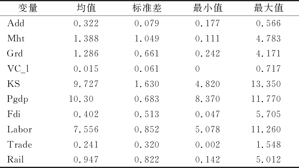 (4)控制变量。人均地区生产总值(Pgdp):采用人均地区生产总值取对数表示;外商直接投资(Fdi):采用各省外商投资年末登记投资额与地区生产总值的比值表示;劳动力数量(Labor):采用各省从业人员数取对数表示;对外开放程度(Trade):采用进出口总额与地区生产总值的比值表示;交通通达性(Rail):采用人均铁路运营里程数表示。