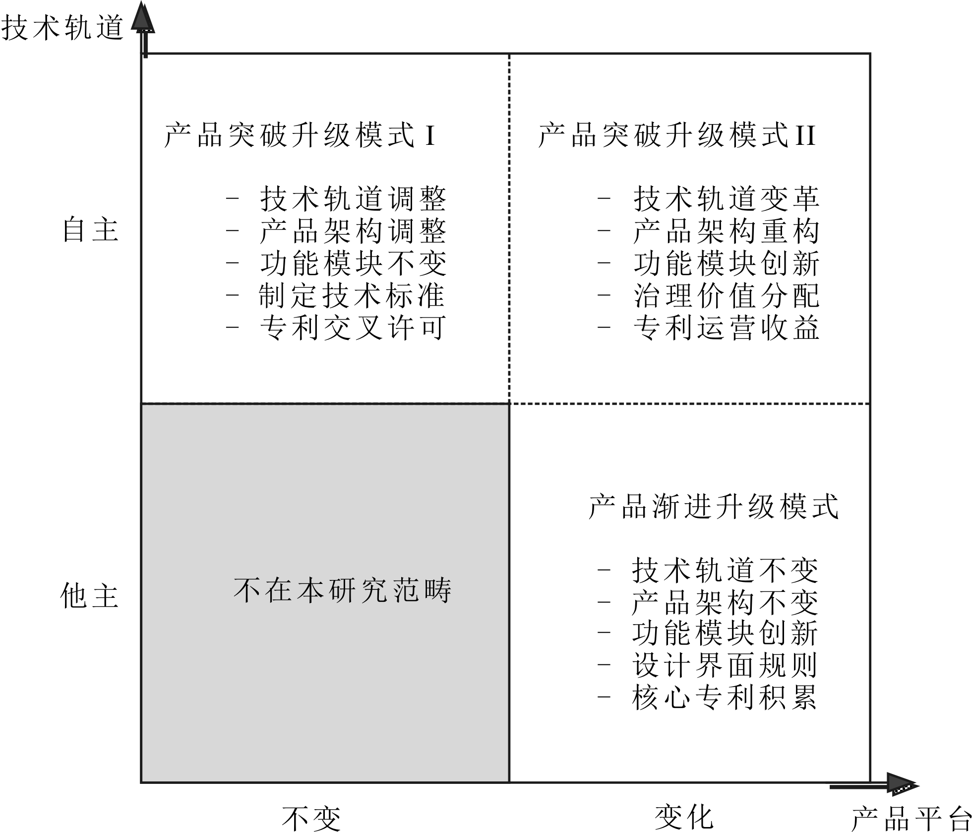借鉴企业升级领域前沿成果[2,3,8-11],开放创新、模块化设计及产品平台研究从多角度揭示提升产品创新能力可促进企业持续升级[12-14]。然而,现有研究对于产品创新究竟是促进企业功能升级还是产品升级仍未形成定论,难以指导NVC龙企功能升级实践。企业功能升级区别于产品升级的核心特征在于其升级能力的自主性[1,8]。基于文献归纳及企业实践发现,上述成果共性是提升企业自主选择技术轨道进行产品创新的能力。为此,本研究尝试从技术自主性视角剖析企业产品创新对功能升级的作用。